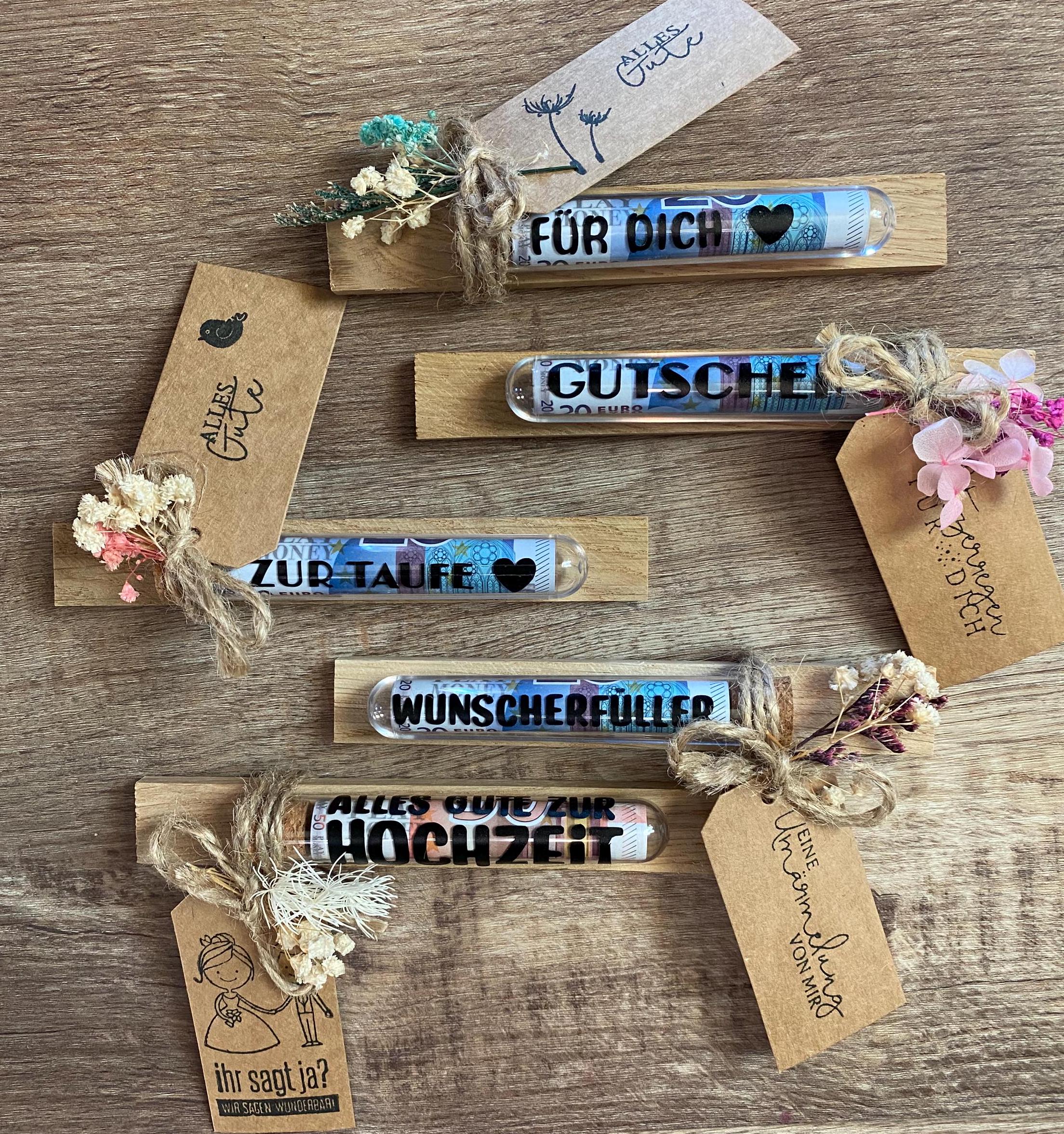 Wunscherfüller Geldgeschenk Set Mit Grußkarte Geschenkbox Reagenzglas Jutesäckchen