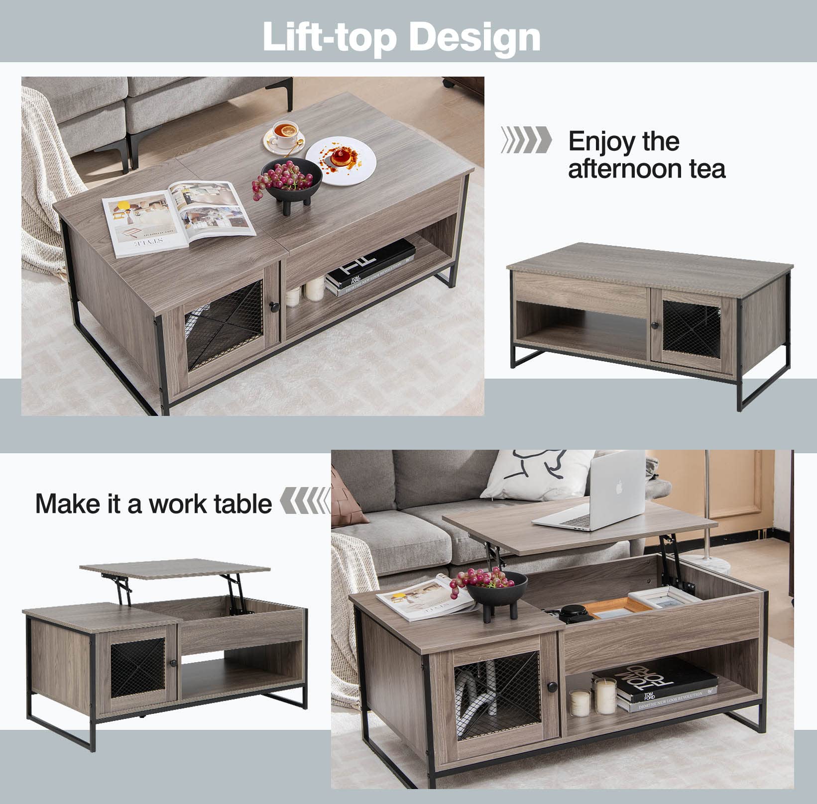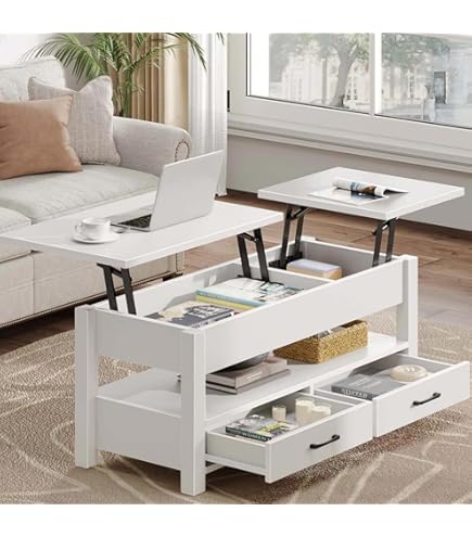 Dieser vielseitige Couchtisch von LIFEZEAL macht dein Wohnzimmer zum Wohlfühlort! Mit Gashebemechanismus lässt sich die Tischplatte von 47,5cm auf 61cm anheben - perfekt fürs Arbeiten, Essen oder gemütliche Abende. Unter der Platte versteckt sich ein geräumiges Fach, dazu offene Regale mit abnehmbarem Mittelteil. Aus robustem Holzwerkstoff und Metall, trägt die Platte 40kg, jedes Regal 20kg. Maße: 100x49,5x47,5cm. Rutschfeste Füße sorgen für Stabilität. In Weiß oder Dunkelgrau erhältlich. Organisiere deinen Raum und genieße maximale Flexibilität!