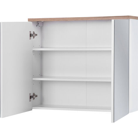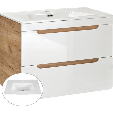 Badmöbel Set LUTON-56 Mit Keramik-Waschtisch & LED-Spiegel - Hochglanz Weiß Mit Wotan Eiche