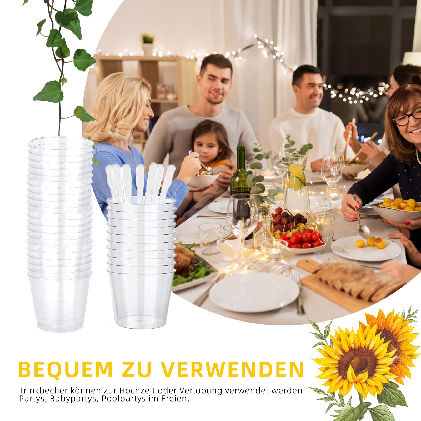 Perfekt für deine nächste Party! 🎉 25 transparente Desserttassen mit 25 passenden Löffeln - alles was du für süße Genussmomente brauchst.\n\nJede Tasse fasst 200ml und ist aus lebensmittelechtem PS-Kunststoff - robust und ohne scharfe Kanten. Die Transparenz lässt Desserts wie Eiscreme, Joghurt, Gelee oder Obst toll zur Geltung kommen.\n\nEinfach zu reinigen mit warmem Wasser, stapelbar für platzsparende Lagerung. Die 10cm Löffel sind perfekt für unterwegs.\n\nIdeal für Geburtstage, Hochzeiten, Catering, Picknicks oder den täglichen Gebrauch. Mach deine Desserts zum Highlight und beeindrucke deine Gäste mit diesen stylischen Schalen!\n\nAll-inclusive Set - einfach auspacken und sofort losfeiern!