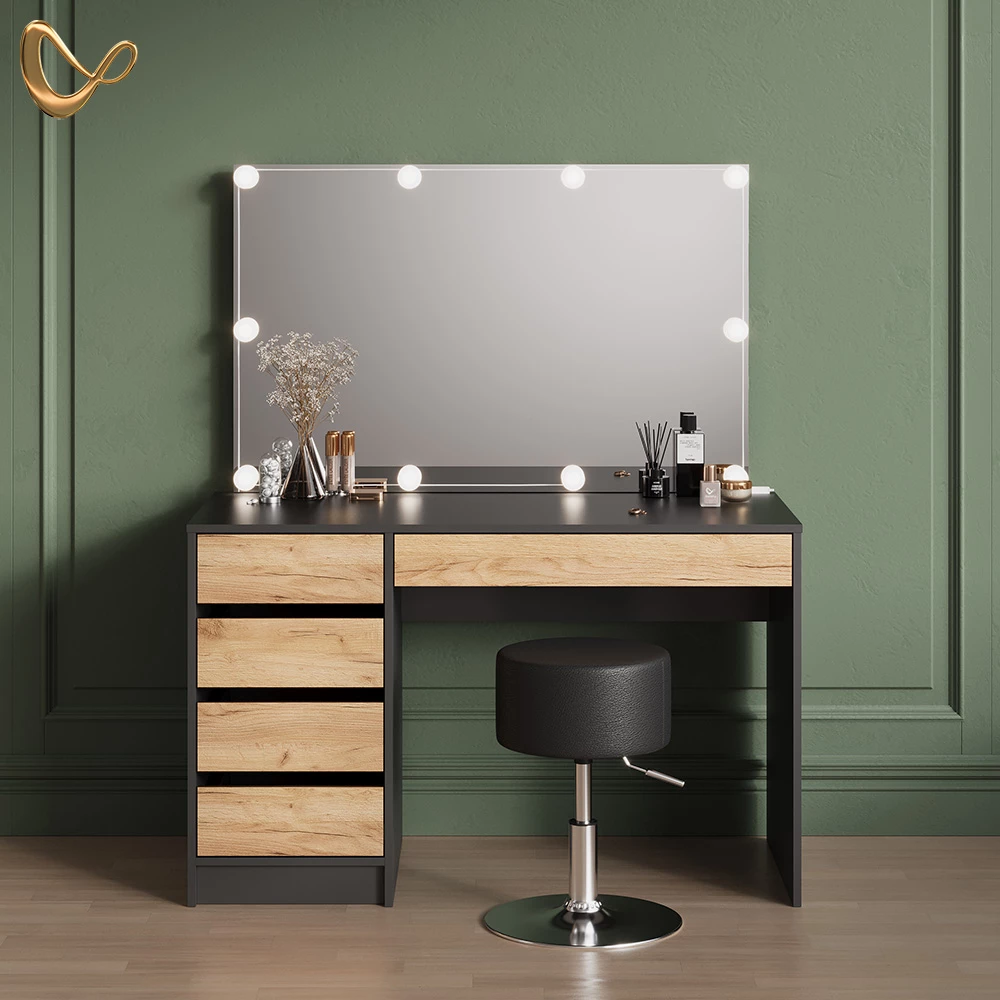 Endlich der perfekte Platz für deine Beauty-Products! Der Livinity Schminktisch Imola in Anthrazit/Gold-Eiche bietet nicht nur Stil, sondern auch super viel Stauraum. Mit 4 kleinen und 1 großer Schublade – alles drin, was du fürs Schminken brauchst. Der große LED-Spiegel sorgt für perfekte Ausleuchtung, egal bei welchem Licht. Maße: 120 x 75 x 55 cm (B x H x T). Aus melaminharzbeschichteter Spanplatte – robust und pflegeleicht (einfach mit feuchtem Tuch abwischen). Lieferung inklusive Montagematerial und Anleitung. Dekoration nicht enthalten – aber du kannst ihn ja nach deinem Geschmack einrichten. Mach dein Zimmer zum Beauty-Hotspot!