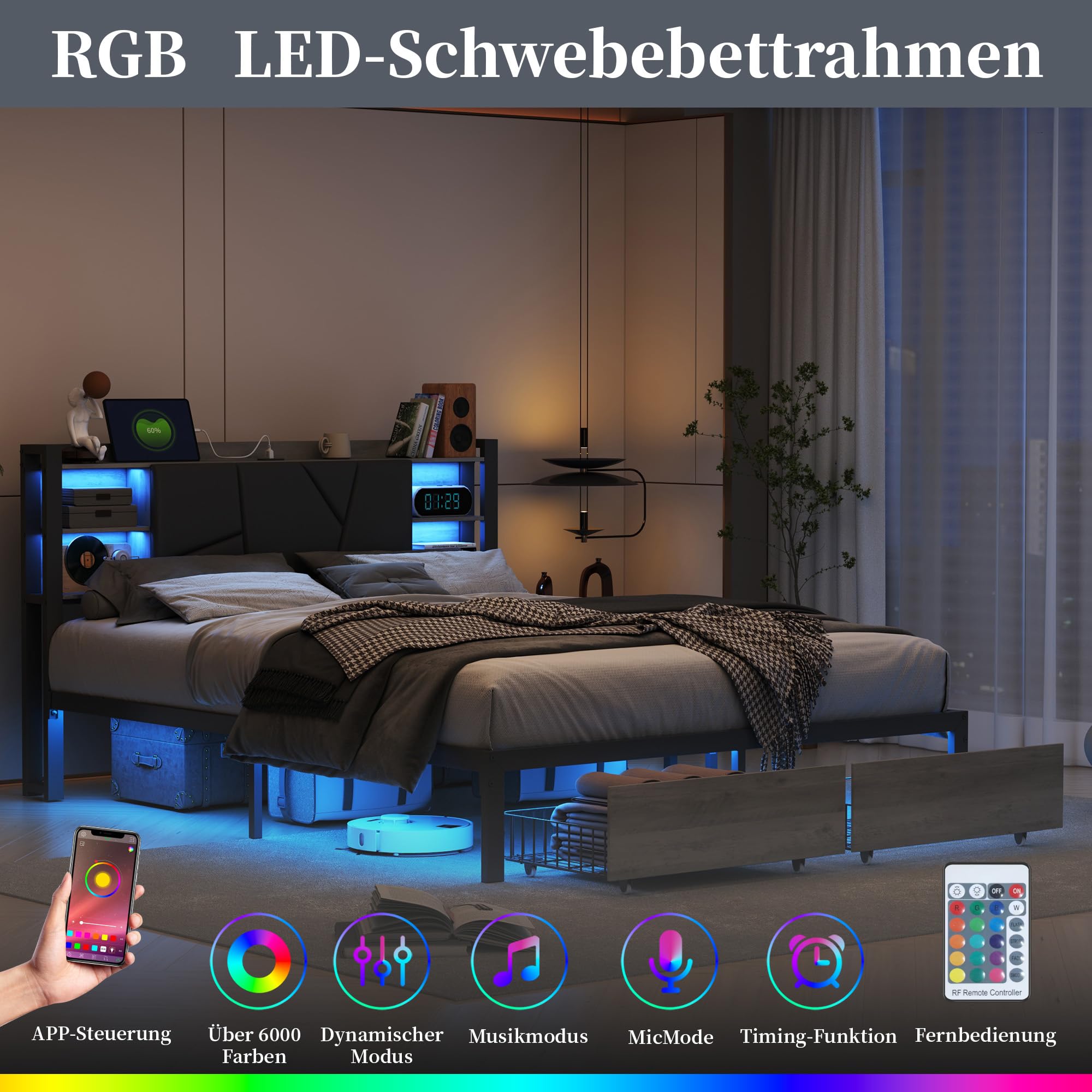 Gxffipw Polsterbett 180x200 Cm Mit LED-Licht & Steckdosen - Modernes Schwebebett Design