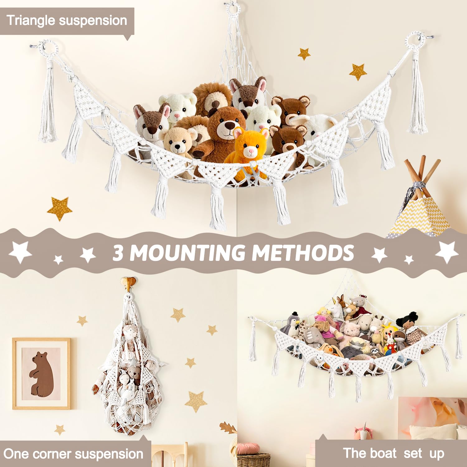 Schluss mit Kuscheltier-Chaos im Kinderzimmer! Dieses süße Makramee-Netz in Lila bietet Platz für all die liebsten Stofftiere. Mit romantischer LED-Lichterkette für gemütliche Stimmung - perfekt als Nachtlicht. Handgewebt mit hübschen Quasten und Ring, einfach an der Wand oder Decke befestigen. Macht aus unordentlichen Kuscheltieren eine dekorative Eye-Catcher. Die LED-Lichter sind energiesparend und sorgen für eine magische Atmosphäre. Ob fürs Mädchen- oder Jungszimmer - dieses Netz bringt Ordnung und sieht dabei noch total niedlich aus. Deine Stofftiere haben endlich ein gemütliches Zuhause!