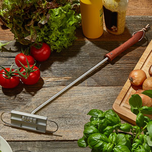 Mit isoliertem Griff - total sicher in der Handhabung. Einfach einschalten, warten bis es heiß ist und dann auf Burger, Steak, Kuchen oder sogar Kokosnüsse drücken!
