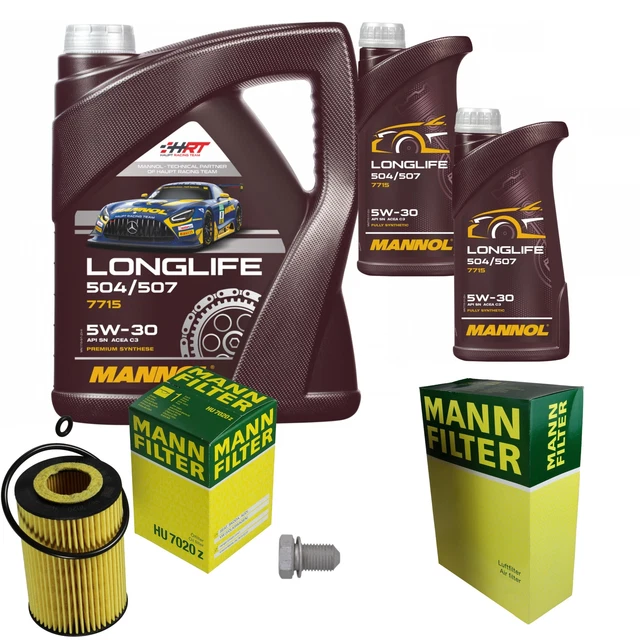 Steht bei deinem Auto die Inspektion an? Dieses Komplett-Paket hat alles was du brauchst! Enthalten: 5 Liter + 1 Liter MANNOL Longlife 5W-30 Motoröl (freigegeben für VW 504/507, BMW Longlife-04, MB 229.51), Ölfilter, Luftfilter, Innenraumfilter und Ablassschrauben-Dichtring. Vollsynthetisches Premium-Öl mit ausgezeichneten Reinigungseigenschaften - schützt deinen Motor optimal. Spart Kraftstoff und sorgt für einfache Kaltstarts bis -45°C. Perfekt für moderne Benziner und Diesel mit Turboaufladung. Alles aus einer Hand - kein langes Suchen nach Einzelteilen. Mach deine Inspektion selbst oder gib es der Werkstatt - so sparst du garantiert Geld!