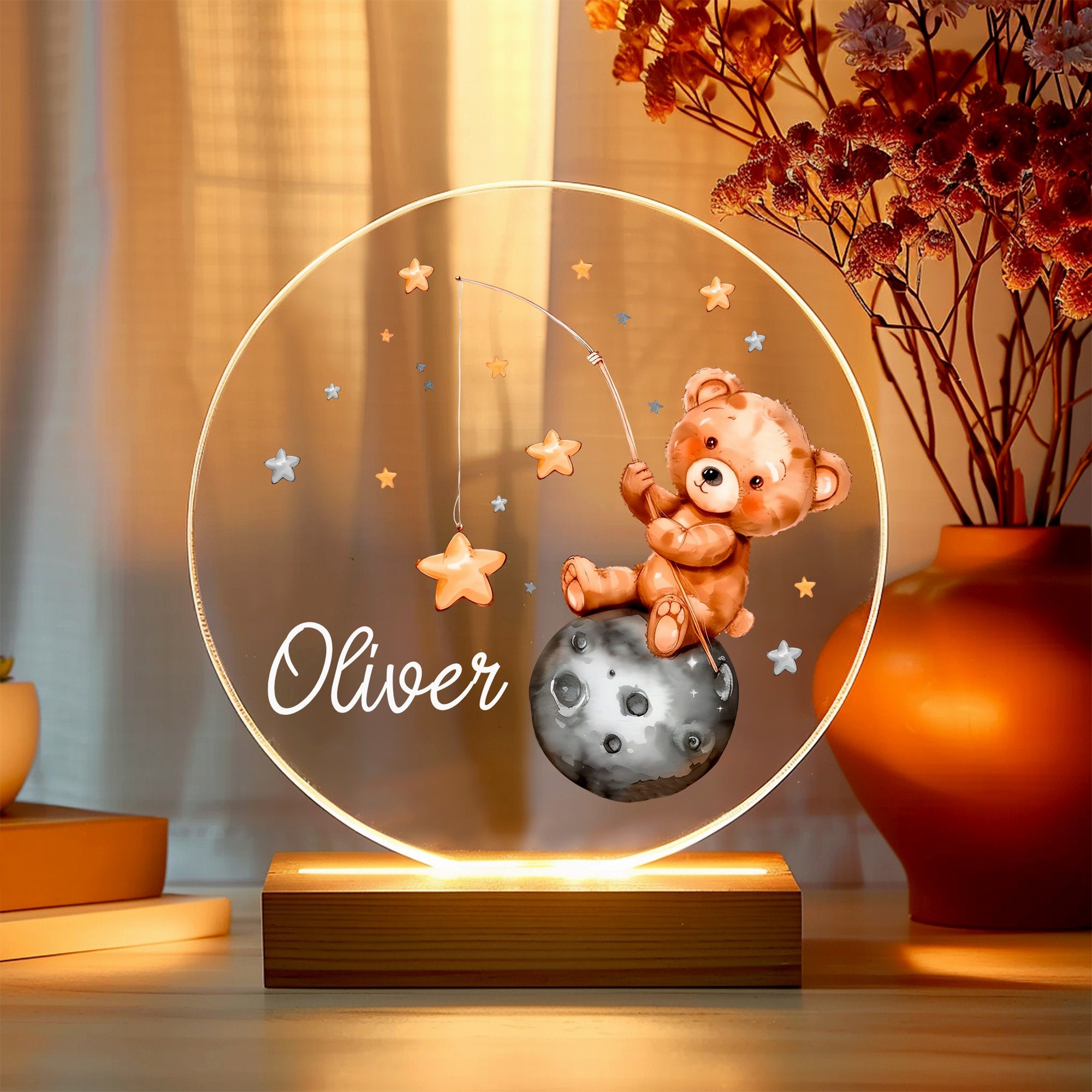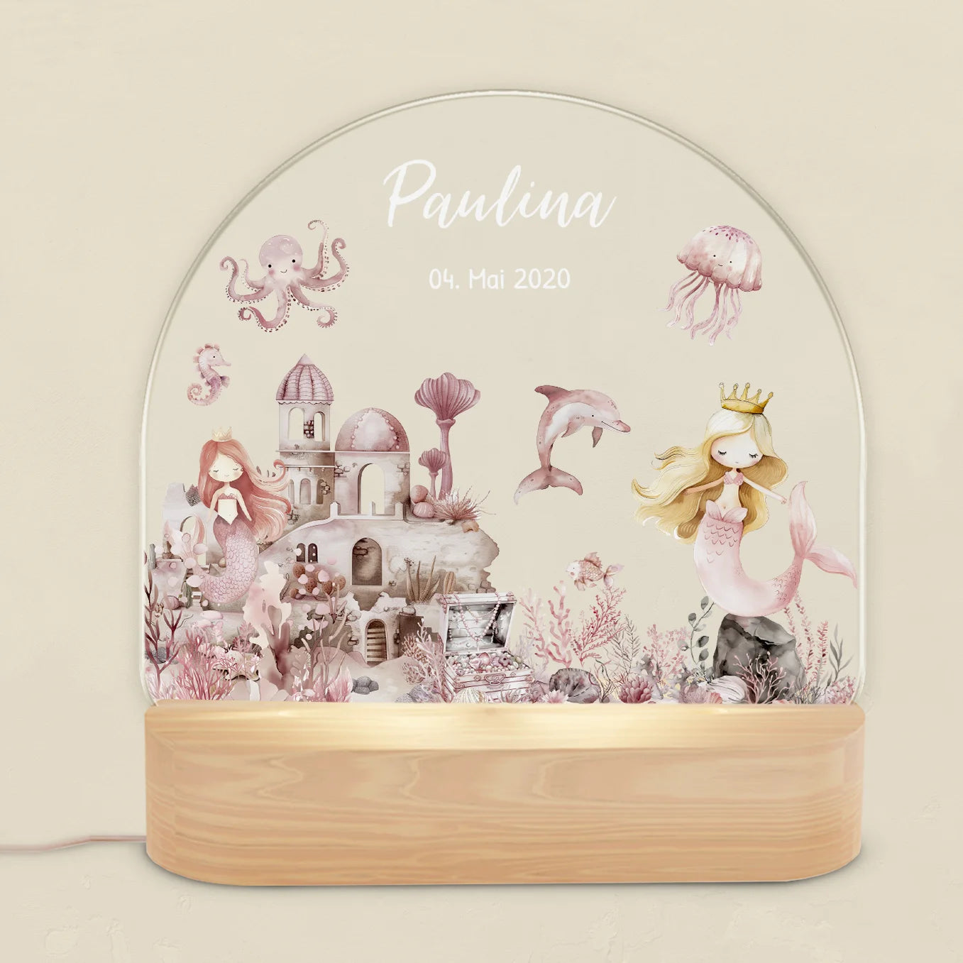 Ein magisches Nachtlicht, das mit persönlicher Note bezaubert! Dieses wunderschöne Meerjungfrau-Nachtlicht wird mit dem Namen und Geburtsdatum deines Kindes personalisiert - ein ganz besonderes Unikat fürs Kinderzimmer. Das sanfte, dimmbare LED-Licht lässt sich von warmem bis kaltem Weiß einstellen und sorgt für die perfekte Atmosphäre beim Einschlafen oder Vorlesen. Aus hochwertigem Buchenholz und bruchsicherem Acrylglas gefertigt, ist es robust und langlebig. Der UV-Druck ist farbintensiv und absolut unbedenklich. Perfekt als Geschenk zur Geburt, Taufe oder zum Geburtstag - eine bleibende Erinnerung, die Jahre lang Freude bereitet. Mehr als nur eine Lampe: Ein tröstlicher Begleiter in der Nacht, der Geborgenheit schenkt und Ängste vertreibt. Dein Kind wird dieses persönliche Nachtlicht lieben!