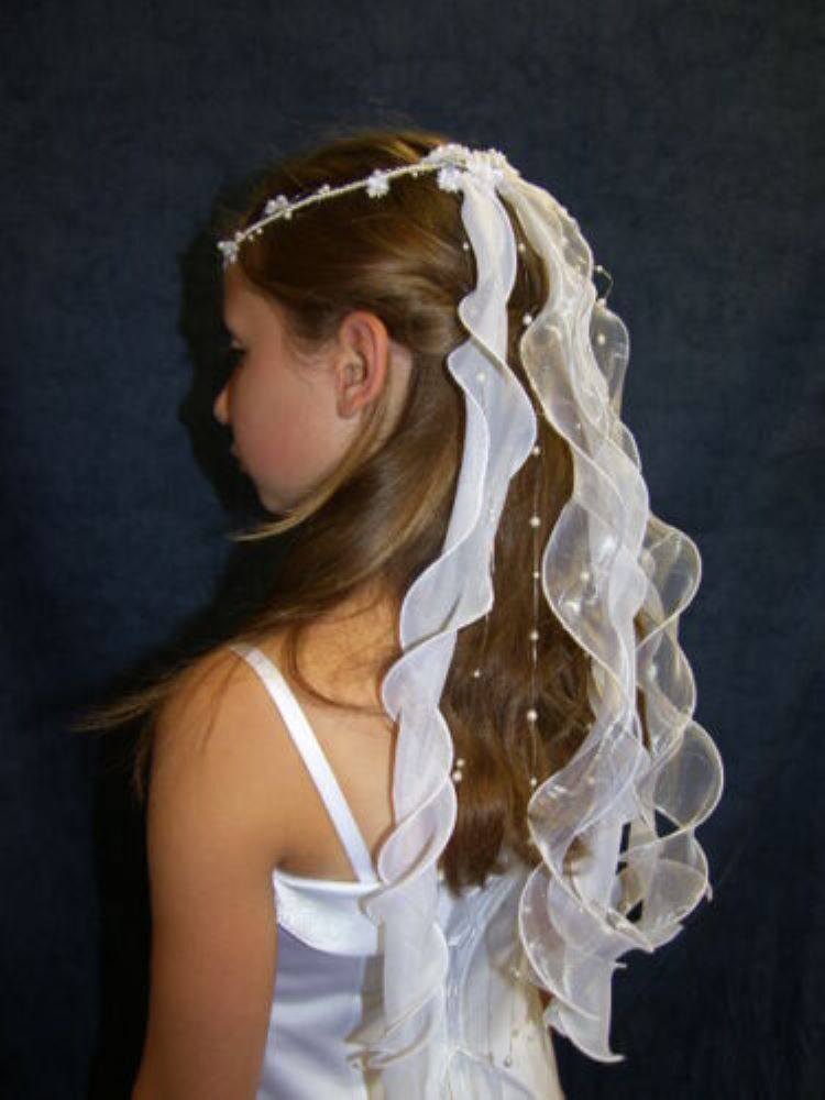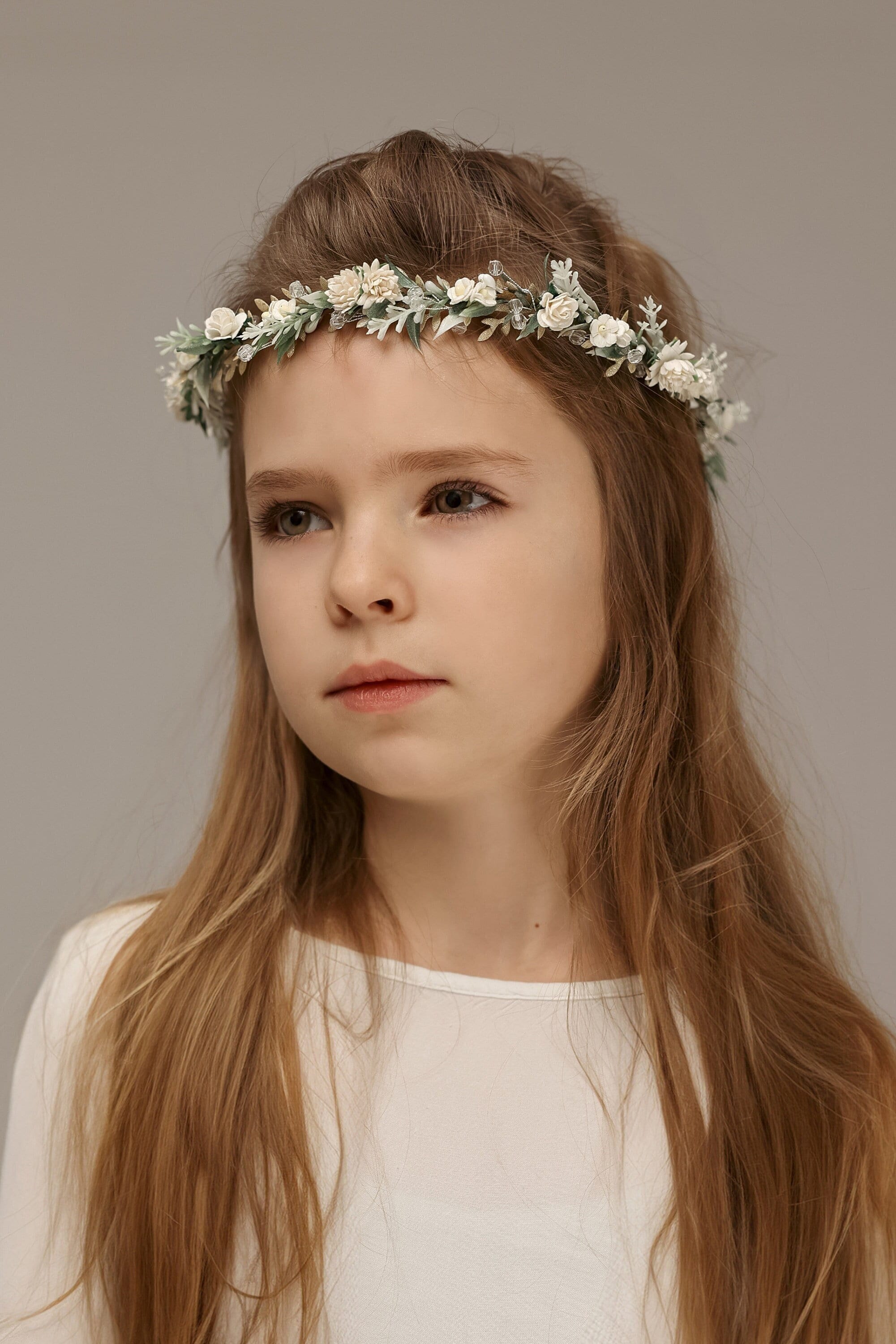 Ein traumhafter Blumenkranz für besondere Anlässe! Perfekt für die Kommunion, Hochzeit oder andere festliche Events. Aus hochwertigen Kunstperlen, Strasssteinen und zartem Chiffonband gefertigt - sieht einfach edel und bezaubernd aus.