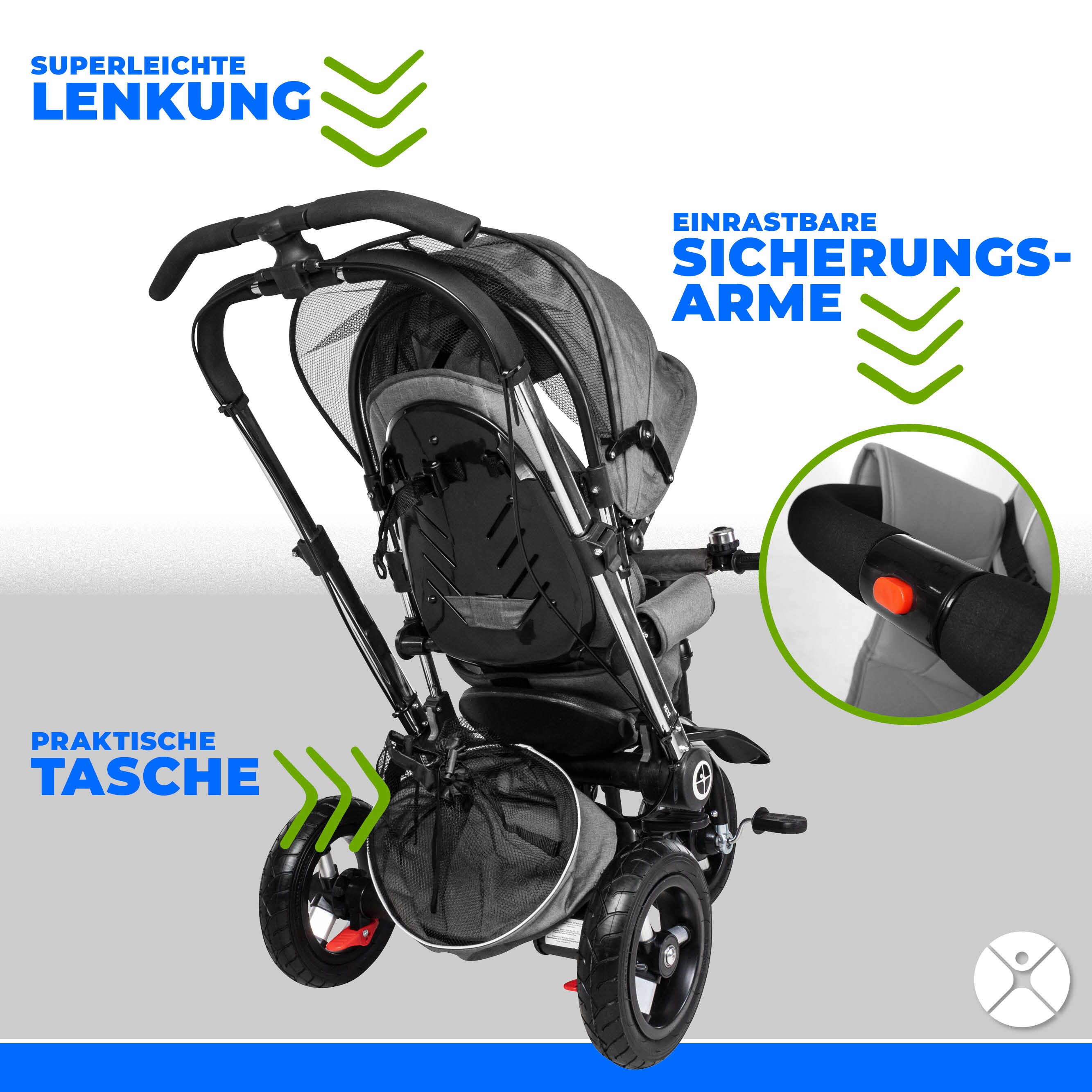 Das ultimative Spielzeug für dein Kleinkind! Dieses 7in1 Kinderdreirad von Miweba wächst mit - von 12 Monaten bis 30 kg. Zuerst schiebst du es bequem als Kinderwagen, später fährt dein Kind selbstständig. Mit 3-Punkt-Sicherheitsgurt, Sonnendach und klingelndem Lenker ist für maximale Sicherheit gesorgt. Die Luftreifen federn jeden Untergrund ab und die rutschfesten Pedale helfen beim ersten Fahrversuch. Besonders clever: Die Schiebestange lässt sich abmontieren, wenn dein Kind alleine fahren kann. Mit praktischer Tasche für Schnuller und Co. In Grau für Jungs und Mädchen gleichermaßen geeignet. Einfach umbauen und immer wieder neu entdecken - so macht das Laufen lernen richtig Spaß!