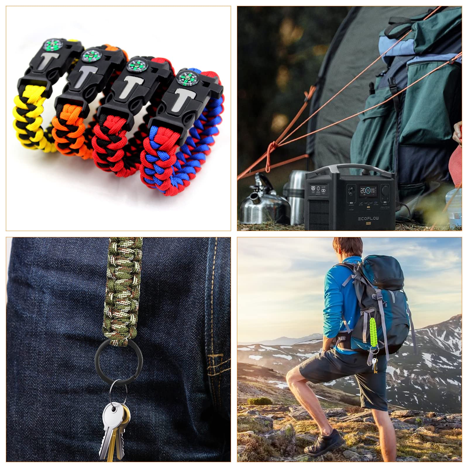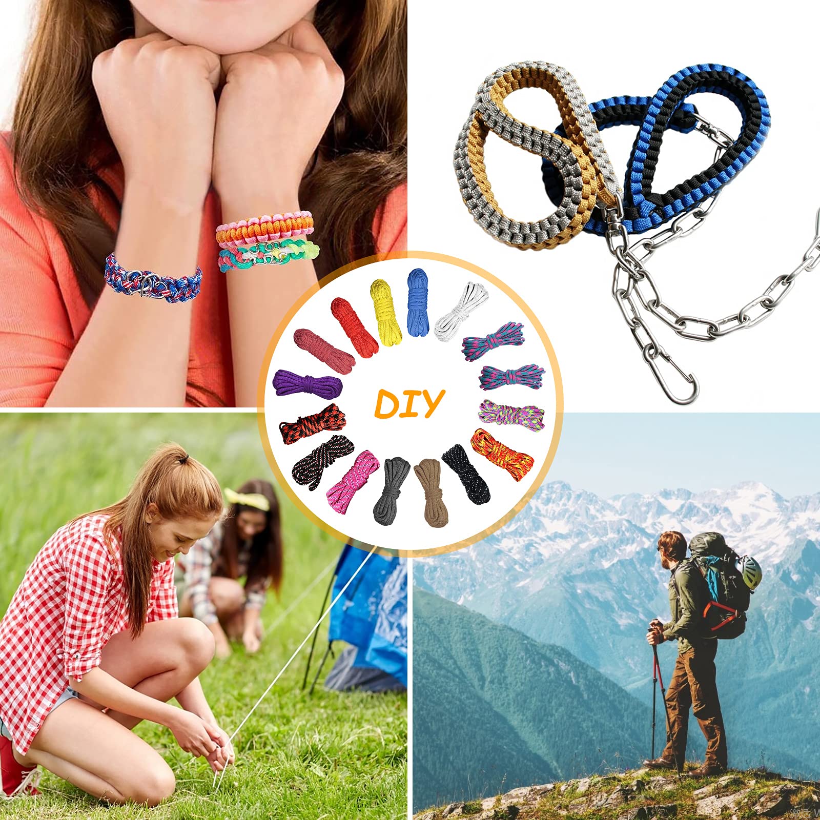 Total vielseitig! Dieses Paracord Set ist perfekt für alle, die gerne basteln oder outdoor unterwegs sind. Die Paracord 550 Nylonschnur ist super robust - hält bis zu 550 Pfund! Im Set ist alles dabei was du brauchst: Verschiedene Farben Paracord, Schnallen, Schlüsselringe, Nähnadeln und Karabiner. Damit kannst du Armbänder, Schlüsselanhänger, Lanyards oder sogar Camping-Ausrüstung selbst machen. Das Nylon-Material ist weich, trocknet schnell und verblasst nicht. Super leicht zu transportieren - passt in jeden Rucksack. Perfekt für Anfänger und Fortgeschrittene! Ob fürs nächste Festival-Armband, als praktischer Outdoor-Helfer oder einfach als kreative Beschäftigung - mit diesem Set bist du bestens ausgestattet! Die Möglichkeiten sind endlos und der Spaß garantiert! Einfach ausprobieren und dein eigenes cooles Accessoire kreieren!