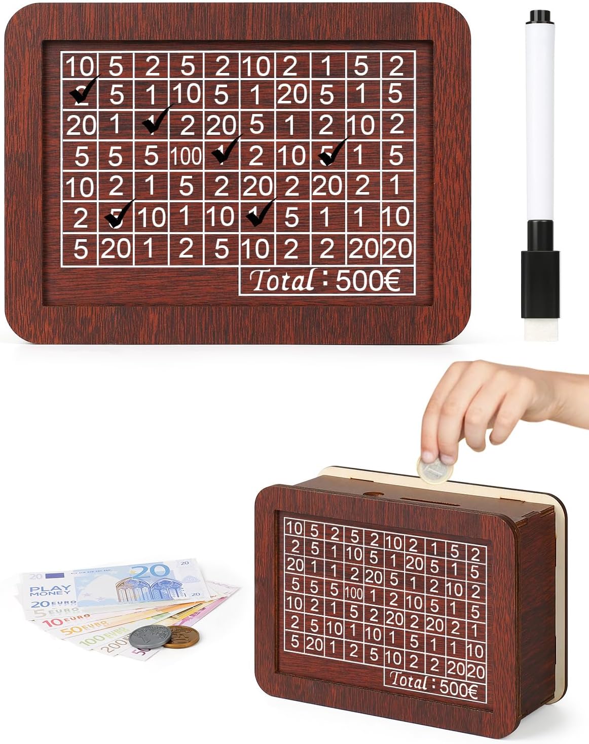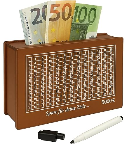 Diese süße Spardose aus Holz macht Sparen endlich richtig Spaß! Mit dabei sind 8 verschiedene Sparziel-Aufkleber (500€, 1000€, 2000€, 3000€, 5000€, 10000€ plus zwei Blanko-Aufkleber für individuelle Ziele) und ein Marker. Das Tolle: Die Spardose ist komplett wiederverwendbar! Einfach das erreichte Sparziel mit dem wasserlöslichen Stift markieren und später wieder entfernen. Die Box wird zerlegt geliefert und lässt sich ganz einfach zusammenstecken - kein Kleber oder Werkzeug nötig. Aus robustem Holz gefertigt, ist sie unzerbrechlich und hat eine glatte, gratfreie Oberfläche. Perfekt für Kinder, um spielerisch den Umgang mit Geld zu lernen, aber auch für Erwachsene, die sich konkrete Sparziele setzen wollen. Macht sich super als Deko im Zimmer und ist ein tolles Geschenk zu Geburtstagen, Weihnachten oder anderen besonderen Anlässen. So macht Sparen wirklich Freude!