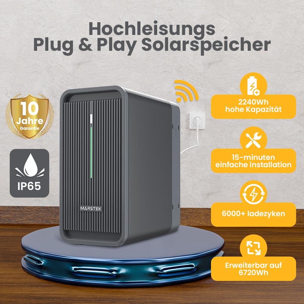 Produziere deinen eigenen Strom - direkt vom Balkon! Das MARSTEK B2500H Balkonkraftwerk mit 2240Wh LiFePO4 Akku und 800W Mikrowechselrichter macht dich unabhängiger vom Stromnetz. IP65 wasser- und staubgeschützt - perfekt für Balkon, Terrasse oder Garten. Bis zu 6000 Ladezyklen und 10 Jahre Garantie. Mit Smart Meter und App-Überwachung für volle Kontrolle. Erweiterbar auf 8,96 kWh mit zusätzlichen Batterien. Spart bis zu 1074 Euro Stromkosten pro Jahr! Plug-and-play Installation - kein Elektriker nötig. Kompatibel mit 99% aller Mikrowechselrichter. Inklusive MC4-Kabel und Bedienungsanleitung. Einfach anschließen und sofort Strom sparen. Perfekt für Mieter und Eigenheimbesitzer!