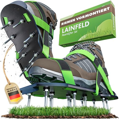 Belüfte deinen Rasen einfach beim Gehen! Diese Vertikutierer-Schuhe mit 26 robusten Stahlspitzen (je 15mm lang) machen die Rasenpflege zum Kinderspiel. Einfach über die eigenen Schuhe ziehen und loslaufen - die Spitzen durchlüften den Boden optimal und entfernen Moos. Vier verstellbare Klettgurte sorgen für sicheren Halt an jeder Schuhgröße. Die grünen Sohlen sind langlebig und mit 625g pro Paar angenehm leicht. Ideal für Frühjahr und Herbst, um deinen Rasen fit zu machen. Im Lieferumfang: Montageschlüssel und alle benötigten Befestigungsteile. Einfacher geht Rasenpflege nicht!