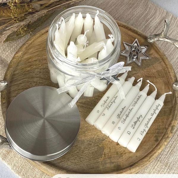 Diese bezaubernden Adventskerzen bringen sofort Weihnachtsstimmung in dein Zuhause! Mit süßen Sprüchen wie 'Weihnachtszauber', 'leuchtende Momente' oder 'Winterwunderzeit' machen sie sich perfekt auf dem Adventskranz oder als Tischdeko. Jede Kerze brennt etwa 6 Stunden und hat schöne Maße: 17,5cm hoch und 1,8cm Durchmesser. Die Sprüche sind mit Wasserschiebefolie aufgedruckt und brennen rückstandsfrei mit ab. Wichtig: Beim Auspacken vorsichtig sein, damit die Folie nicht beschädigt wird! Im Set erhältlich mit 2, 3 oder 4 Kerzen - perfekt als kleines Geschenk für Kolleginnen, Freundinnen oder die Nachbarin. Im stabilen Karton sicher verpackt. Macht deine Weihnachtsdekoration komplett und sorgt für gemütliche Stunden bei Kerzenschein. Einfach anzünden und den Zauber der Adventszeit genießen!
