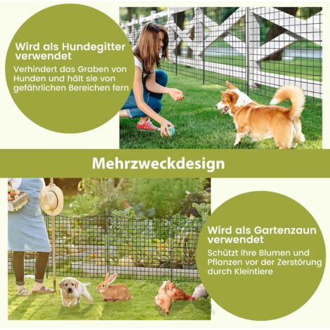 Schutz und Style für deinen Garten! Dieser dekorative Metallzaun mit 81cm Höhe und integriertem Tor hält Hunde und Kaninchen von deinen Blumenbeeten fern. Einfache grabenlose Installation mit mitgelieferten Bodenpfählen - einfach in die Erde stecken und fertig! Rostfreie Metallkonstruktion mit bogenförmigem Design für zusätzlichen Charme. Jedes Panel misst 74cm Breite, flexibel anpassbar an deine Gartengestaltung. Funktional und schön - die perfekte Lösung für tierliebende Gärtner!