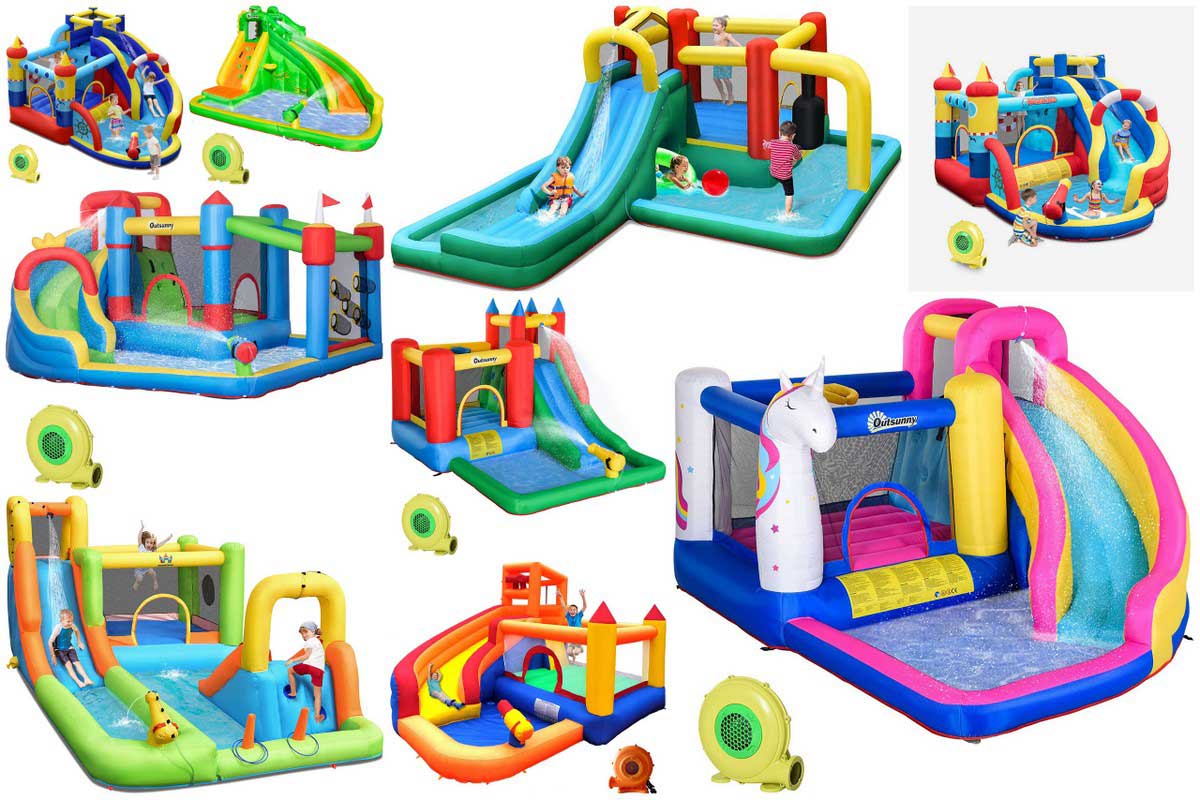 Riesige Hüpfburg Mit Wasserrutsche & Gebläse - Doppelrutsche, Regenbogentor & Wasserkanonen