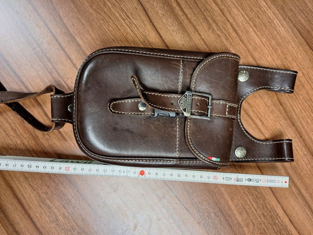 Suchst du eine stylische und praktische Tasche für deine Motorrad-Touren oder Outdoor-Abenteuer? Diese coole Biker-Beintasche aus 100% echtem Rindsleder mit Wolf-Motiv ist genau dein Ding!\\n\\nDie Tasche im Vintage-Look gibt's in Schwarz, Braun oder Cognac - jedes Stück ein Unikat mit kräftiger Wolf-Prägung. Du kannst sie als Beintasche, Hüfttasche oder Gürteltasche tragen, je nachdem was dir besser gefällt. Die verstellbaren Gurte (Hüftgurt 88-135 cm) mit Karabiner und Klickverschluss sorgen für perfekten Halt - selbst bei schnellen Motorradfahrten.\\n\\nPraktisch ist sie auch: In der großen Haupttasche (20×20 cm) findest du Platz für Handy, Geldbörse und wichtige Papiere. Dazu kommen eine weitere Reißverschlusstasche und ein Einsteckfach - alles gut organisiert und sicher verschlossen.\\n\\nDas robuste Leder (1,0-1,1 mm dick) mit stabilen Nähten und Metallbeschlägen hält so einiges aus. Ob auf der Motorrad-Tour, beim Festival-Besuch oder auf Reisen - diese Tasche ist dein treuer Begleiter mit echtem Biker-Flair!