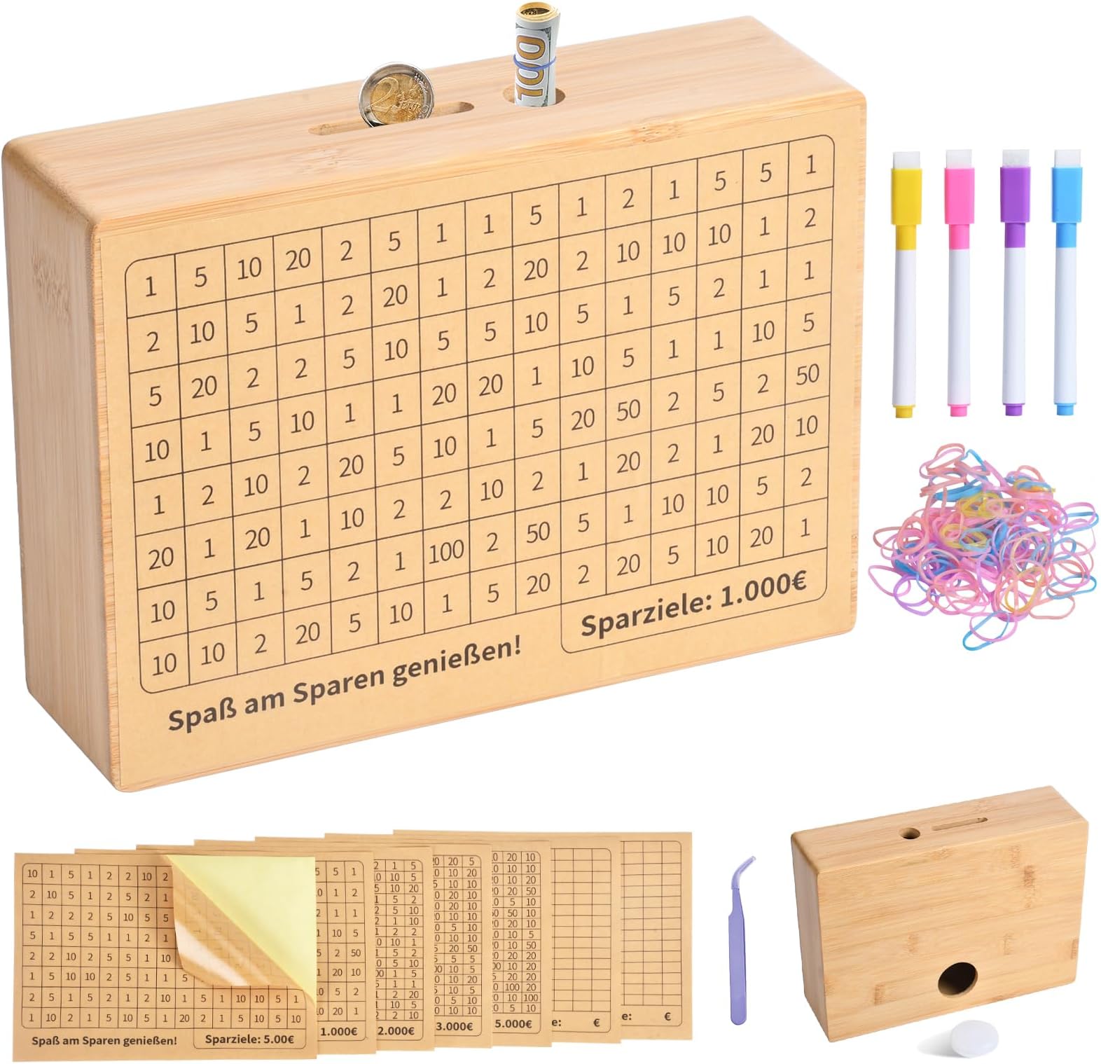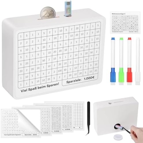 So macht Sparen richtig Spaß! Diese coole Holz-Spardose hat einen integrierten Zähler, mit dem du dein Sparziel immer im Blick hast. Egal ob 1.000€, 5.000€ oder sogar 10.000€ - du kannst die Acryltafel mit dem beiliegenden Stift beschriften und deinen Fortschritt verfolgen. Wenn du dein Ziel erreicht hast, wischst du einfach die Markierung ab und fängst das nächste Sparprojekt an! Aus robustem Naturholz gefertigt, sieht sie nicht nur schick aus, sondern hält auch ewig. Zwei Einwurfschlitze - einer für Scheine, einer für Münzen - machen das Sparen super einfach. Perfekt für Kinder, um den Umgang mit Geld zu lernen, aber auch für Erwachsene, die sich ein besonderes Ziel setzen wollen. Einfach zusammenbauen (geht ratzfatz!) und lossparen. Ein tolles Geschenk für jeden Anlass!