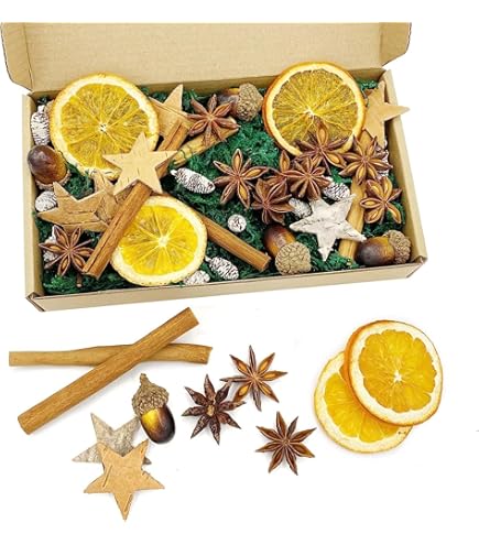 Im Set ist alles dabei: 8 Zimtstangen, 10 getrocknete Orangenscheiben, 20g Moos, 10 Sternanis, 8 Birkenscheibensterne, 20 Tannenzapfen, 8 Eicheln, 5 goldene Kugeln und sogar ne Lichterkette! Wahnsinn, oder?