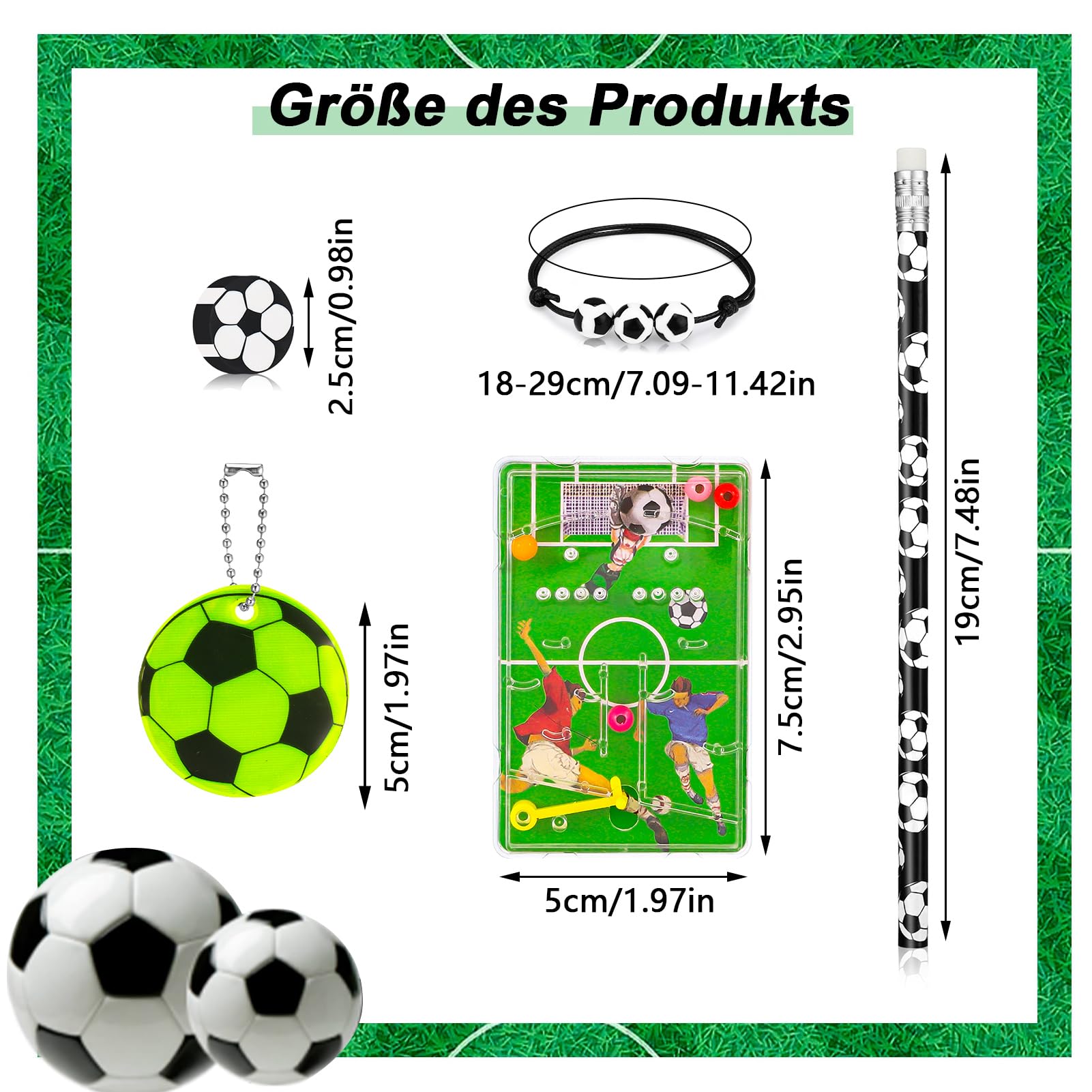 Das komplette Set für die ultimative Fußball-Party! In dem Paket findest du alles, was kleine Fußballfans begeistert: 10 Fußball-Bleistifte aus Holz, die super schreiben, 10 niedliche Fußball-Radiergummis, 10 coole Armbänder in Schwarz-Weiß, 10 Geschenktüten mit Fußball-Motiv und 10 kleine Flipperspiele zum Sofort-Spielen. Alles im klassischen Fußball-Design, das jeder sofort erkennt. Die Bleistifte sind etwa 19cm lang, die Radiergummis mini aber praktisch, und die Armbänder verstellbar - passen also für jedes Kinderhandgelenk. Perfekt um die Gastgeschenktüten zu füllen oder als kleine Preise bei Spielen. Mach den Geburtstag deines Kindes zum Fußball-Event! Und das Beste: Die Qualität stimmt - kein Billig-Kram, der sofort kaputt geht.