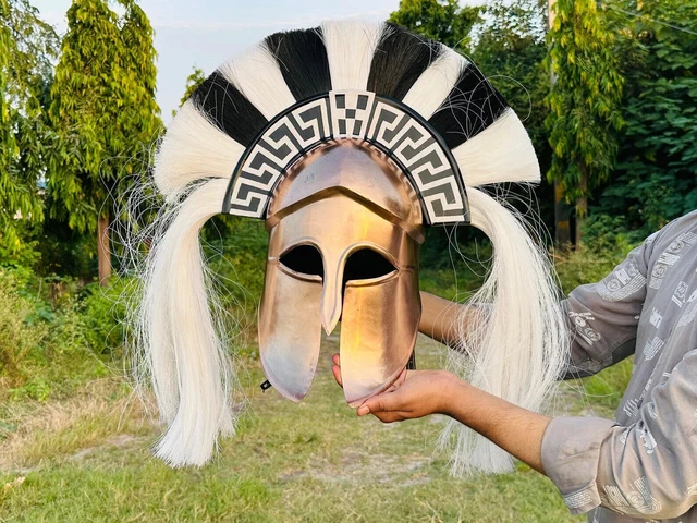 Fühle dich wie ein echter Spartaner-Krieger! Dieser atemberaubende Helm im korinthischen Design mit seiner markanten schwarzen Feder ist ein absoluter Hingucker. Mit den charakteristischen länglichen Wangenschützern und dem ausgeprägten Nasenschutz sieht er nicht nur authentisch aus, sondern vermittelt auch dieses unverwechselbare kämpferische Feeling. Aus robustem Metall mit antikem Bronze-Finish gefertigt, überzeugt er durch seine hohe Qualität und Langlebigkeit. Das innenliegende Lederband sorgt für einen bequemen und sicheren Sitz - egal ob bei langen LARP-Events, Cosplay-Conventions, Halloween-Partys oder einfach nur zur Dekoration. Die realistische schwarze Rosshaar-Feder auf dem erhöhten Wappen komplettiert den furchtlosen Look perfekt. Ein Muss für jeden Mittelalter-Fan, Sammler oder Geschichtsbegeisterten! Auch als beeindruckende Deko in deinem Zuhause oder Studio macht dieser Helm eine super Figur.