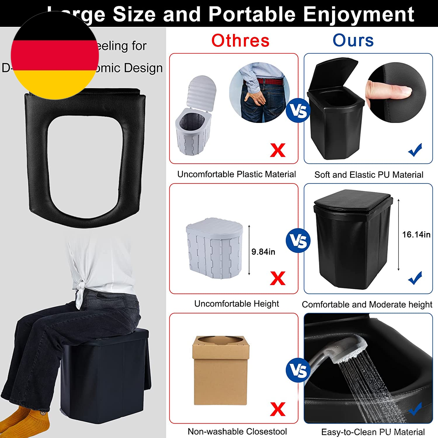 Perfekt für Camping, Festivals oder Notfälle! Diese faltbare Campingtoilette ist dein Retter in der Not. Sie lässt sich super einfach aufklappen - innerhalb von Sekunden steht sie bereit. Mit 30 Litern Fassungsvermögen hast du genug Platz, und die stabile Bauweise hält bis zu 150 kg aus. Aus wasserdichtem PP-Material, also keine Gerüche und leicht zu reinigen. Im Lieferumfang ist alles dabei: Toilette mit Deckel, Matte, Aufbewahrungstasche, Müllbeutel und sogar Deo-Sticker gegen unangenehme Gerüche. Nach Gebrauch einfach zusammenklappen - sie nimmt kaum Platz weg und passt in jeden Kofferraum. Die versteckten Griffe machen das Tragen besonders easy. Du kannst sie nicht nur als Toilette nutzen, sondern auch als Mülleimer, Angelhocker oder Campingstuhl. Ob beim Roadtrip, Zelten oder auf dem Festival - mit dieser mobilen Toilette bist du immer auf der sicheren Seite. Einfach unverzichtbar für alle Outdoor-Aktivitäten!