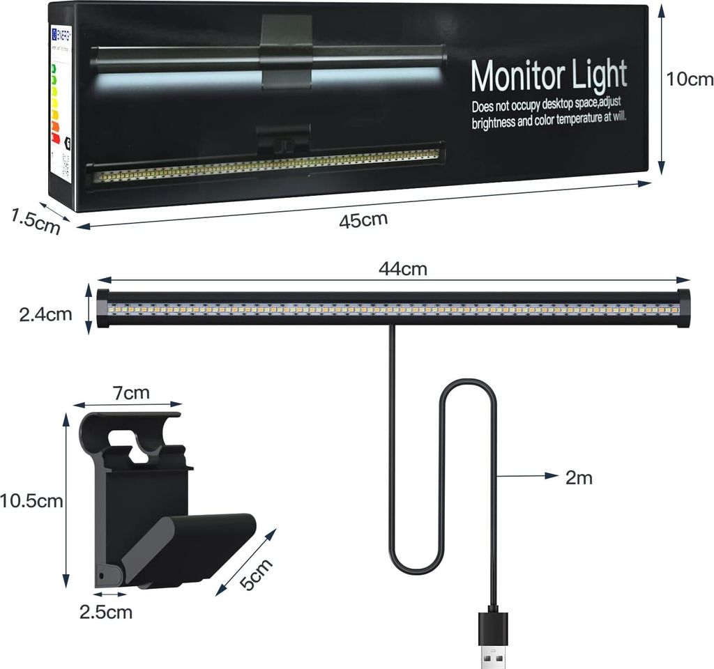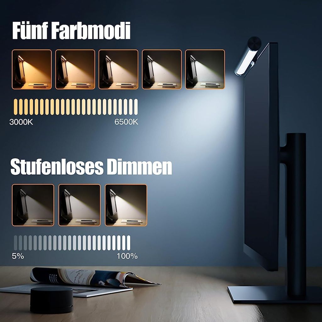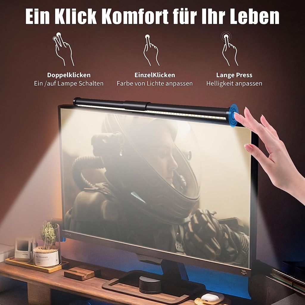 Mann, ist das praktisch! Diese COMANYI Monitor Lampe sorgt für perfektes Licht an deinem Arbeitsplatz! Das 45° asymmetrische Design verhindert Blendung auf dem Bildschirm - super augenschonend! Mit CRI Ra95 für lebendige Farben! Drei Lichtmodi: Frontlicht, Stimmungsrücklicht oder beides kombiniert! Die Helligkeit ist in 6 Stufen einstellbar, dazu drei Farbtemperaturen (3100K, 4200K, 6400K)! Einfache Montage an den meisten Monitoren (0,20-1,77 Zoll stark)! Per USB betrieben - keine extra Steckdose nötig! Mit kabelloser Fernbedienung für bequeme Bedienung! Wenn du also bei langen Computer-Sessions deine Augen entlasten willst, ist diese Screenbar genau das Richtige!