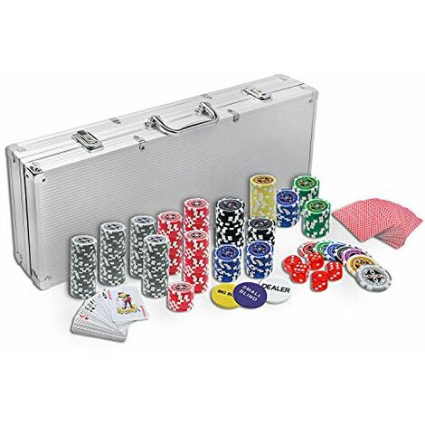 Fühl dich wie im echten Casino! Dieses Monucep Pokerset mit 300 Chips macht jede Pokerrunde zum Profi-Erlebnis. Die Chips haben einen Metallkern und wiegen 12 Gramm - genau das richtige Gewicht für authentisches Spielgefühl.\n\nHochwertiger Aluminium-Koffer: Verschließbar und stabil - ideal für Turniere oder Spieleabende bei Freunden. Alles sicher verstaut und immer griffbereit.\n\nKomplettes Set: 300 reflektierende Laser-Jetons, 2 Pokerdecks, 5 Würfel, 1 Dealer-Button und 2 Schlüssel. Alles, was du für eine echte Pokerrunde brauchst.\n\nFür Anfänger und Profis: Mit deutscher Anleitung finden auch Neueinsteiger schnell ins Spiel. Du hast die Wahl zwischen 300 oder 500 Chips - je nachdem wie viele mitspielen.\n\nPerfekt für Cash Games oder Turniere zu Hause. Mach deinen Spieleabend unvergesslich - bestell jetzt und sei der King am Pokertisch!