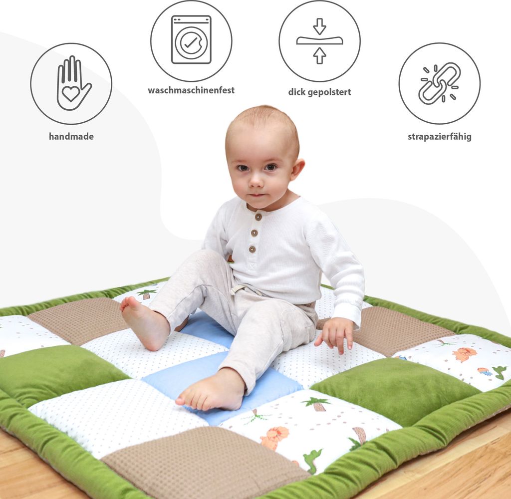 So eine süße Krabbeldecke für dein Baby! Mit niedlichem Elch-Motiv in Grau, komplett aus weicher Baumwolle gemacht. Super angenehm für die zarte Babyhaut - keine Verletzungen, keine Reibung am Boden. Perfekt zum Krabbeln, Spielen oder auch fürs Nickerchen. Mit 90cm Durchmesser bietet sie genug Platz für die ersten Abenteuer. Sie wiegt nur 0,45kg und ist damit super handlich. Sieht nicht nur niedlich aus, sondern ist auch praktisch: hält die Babykleidung sauber und macht sich gut im Kinderzimmer, Schlafzimmer oder Spielzimmer. Einfach in der Maschine zu waschen oder von Hand. Passt perfekt als Geschenk zur Geburt oder Taufe. Dein Baby wird diese gemütliche Ecke lieben!