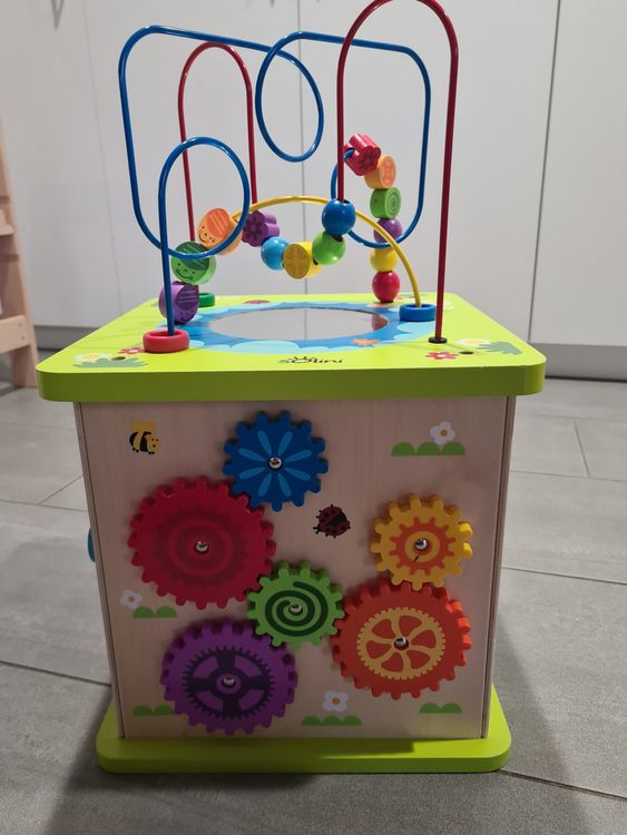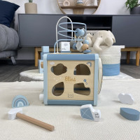Ein personalisierter Motorikwürfel, der Kinderaugen leuchten lässt! Dieser vielseitige Activity Cube aus FSC-zertifiziertem Holz ist das ideale Geschenk zur Geburt, Taufe oder zum 1. Geburtstag. Auf Wunsch wird er mit dem Namen des Kindes graviert – so wird er zu einem einzigartigen Erinnerungsstück. Auf jeder Seite gibt’s was zu entdecken: ein Xylophon, Steckformen, eine Motorikschleife und ein Schiebespiel fördern spielerisch Feinmotorik und Farbverständnis. In dezenten Blau-, Weiß- und Grautönen ist der Würfel auch als Deko im Kinderzimmer ein Hingucker. Hochwertig verarbeitet, mit abgerundeten Ecken und liebevollen Details. Ein Geschenk, das nicht nur Spaß macht, sondern auch lange in Erinnerung bleibt.