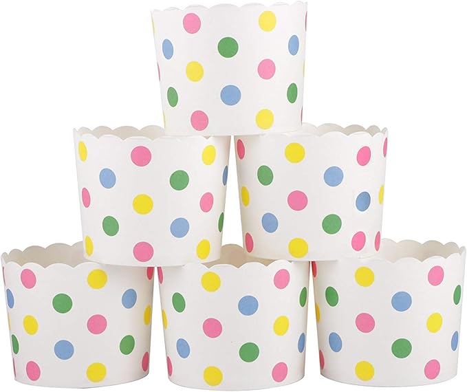 Hey! Hier hast du 150 richtig süße Muffinförmchen in drei knalligen Farben - je 50 Stück in Rosa, Blau und Gelb. Die sind mega praktisch: Aus festem Backpapier in Lebensmittelqualität, total unbedenklich und halten auch fetthaltigen Teig problemlos aus. Ob im Ofen, Mikrowelle oder Dampfgarer - die Förmchen machen einfach alles mit! Perfekt nicht nur für Muffins, sondern auch für kleine Kuchen, Eisbecher oder Desserts. Super für Kindergeburtstage, Hochzeiten oder einfach wenn du Bock auf Backen hast. Die punkten echt mit ihrem coolen Polka-Dots-Design und machen jede Leckerei zum Hingucker!