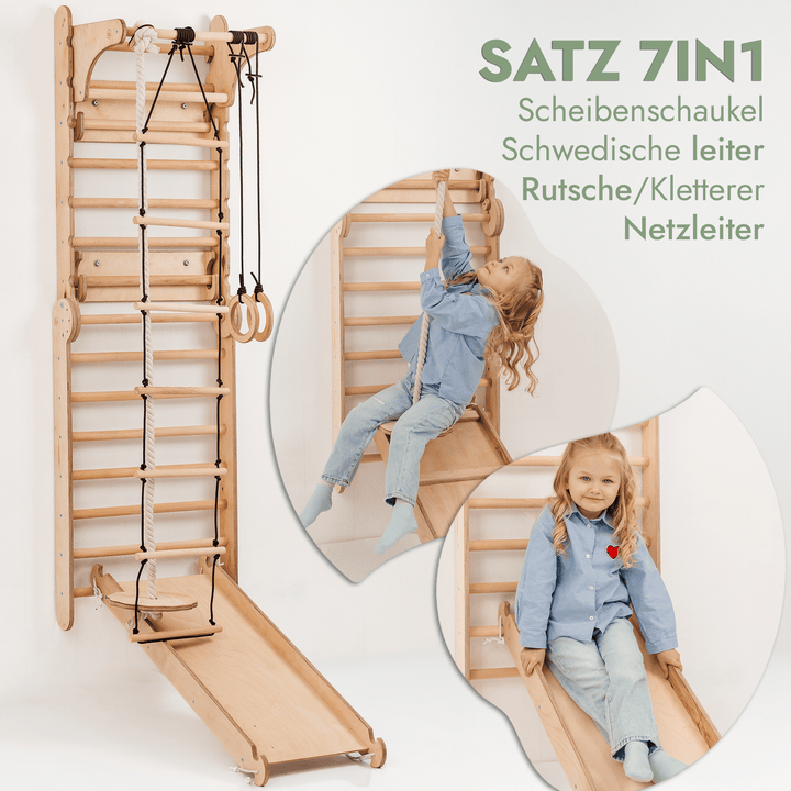 Sportbegeisterte aufgepasst! Diese RINAGYM Sprossenwand 'Eco-Pine' verwandelt euer Zuhause in ein echtes Fitnessstudio. Aus Kiefernholz mit Buchenrundstäben - robust und langlebig. Komplett mit höhenverstellbarer Klimmzugstange, Turnringen, Seilleiter und Kletterseil aus Polypropylen. Höhe 210 cm, Breite 70 cm, Tiefe ca. 60 cm - braucht nur etwa 1 m² Platz! Perfekt für die ganze Familie - Erwachsene und Kinder ab 3 Jahren (natürlich mit Aufsicht). Getestet nach EN 913 Norm und belastbar bis 100 kg. Könnt ihr frei aufstellen oder sicher an der Wand mit 6 Befestigungspunkten montieren. Ideal für Krafttraining, Dehnung, Mobilität und Koordination. Die Oberfläche ist mit wasserbasiertem, speichel- und schweißfestem Lack versiegelt. So habt ihr immer ein komplettes Trainingsgerät parat - ob morgens zum Wachwerden oder abends zum Auspowern. Einfach aufbauen und sofort loslegen! Damit macht Fitness zu Hause richtig Spaß - für Groß und Klein. Die Vielseitigkeit ist enorm: Klimmzüge, Liegestütze, Klettern - alles möglich! Ein Investment in eure Gesundheit, das sich wirklich lohnt!