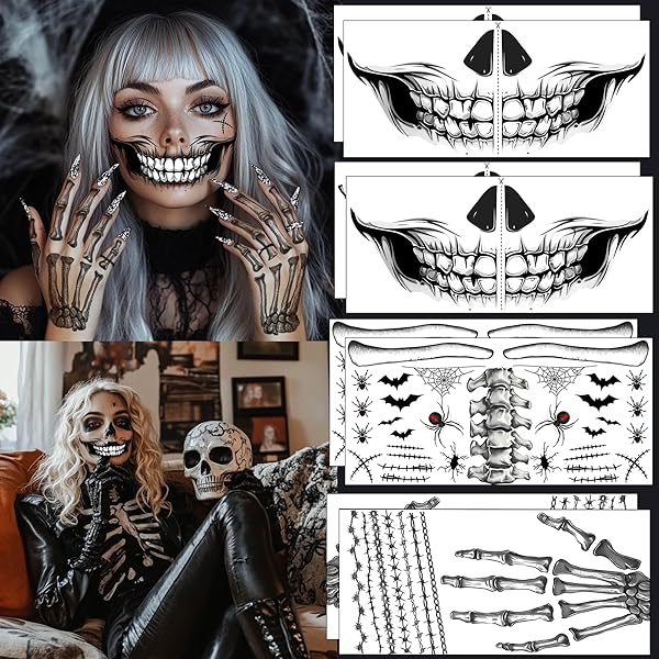 Halloween Mund Tattoos Set - 10 Skull Gesichtstattoos Wasserdicht Temporär