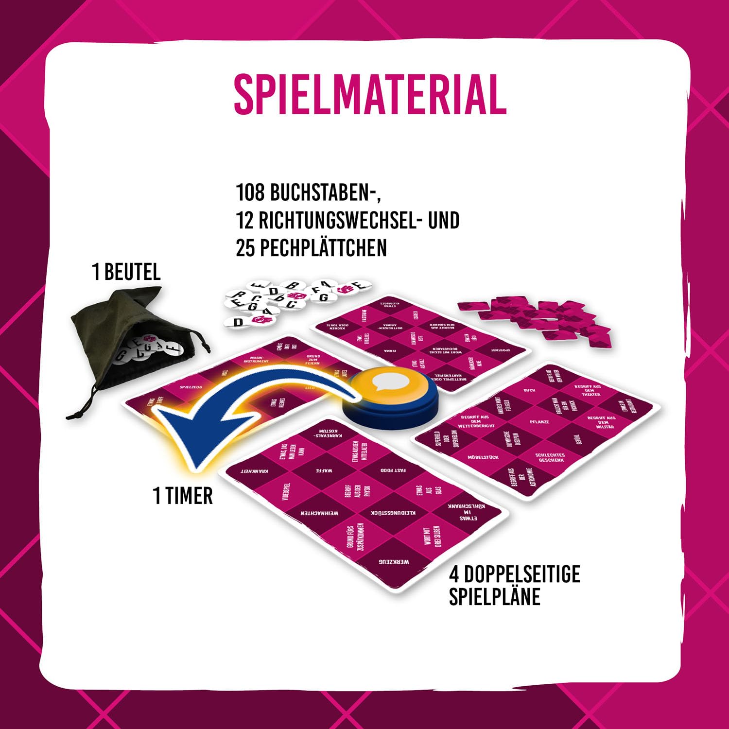 Lust auf ein Spiel, bei dem es richtig zur Sache geht? Oh My Word von KOSMOS ist das perfekte Partyspiel für Wortakrobaten und solche, die es werden wollen! Das Prinzip ist einfach: Buchstabe ziehen, Kategorie lesen und schnell einen passenden Begriff nennen - bevor der Zufallstimer (25-45 Sekunden) piepst! Mit 120 verrückten Kategorien wie 'Pizzabelag', 'Schlechtes Geschenk' oder 'Etwas aus dem Mittelalter' ist jeder Spieleabend garantiert anders. Für 2-6 Spieler ab 10 Jahren super geeignet - ob mit Familie oder Freunden. Der nervenaufreibende Timer sorgt für actionreiche Runden und viele Lacher. Wer am Ende die wenigsten Minuspunkte hat, gewinnt - aber eigentlich gewinnen alle, weil's so viel Spaß macht! Schnell zu lernen, mit hohem Wiederspielwert - perfekt für gemütliche Abende oder Partys. Also, schnapp dir deine Freunde und finde heraus, wer der schnellste Wortkünstler ist! Achtung: Suchtgefahr - dieses Spiel macht süchtig nach mehr Wortspaß!