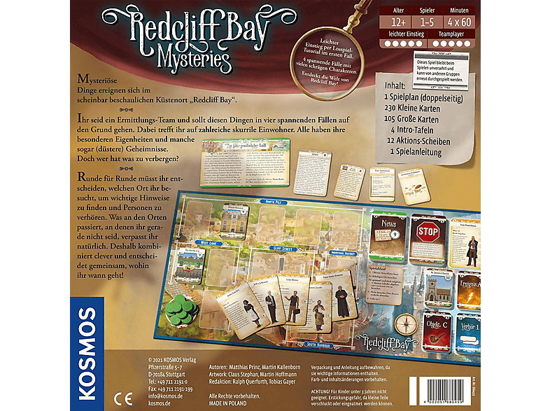 Werde zum Ermittler in Redcliff Bay! In diesem spannenden Detektivspell von KOSMOS ermittelst du in vier mysteriösen Fällen in einem malerischen Küstenort, wo irgendwas ganz schön komisch ist... Die schrägen Einwohner halten so manches Geheimnis verborgen! Gemeinsam mit 1-4 Mitspielern (ab 12 Jahren) entscheidest du, welchen Spuren du folgst und welche Orte du untersuchen willst. Das besondere: Du kannst nicht überall gleichzeitig sein und verpasst so manchen Hinweis - also diskutiert gut, kombiniert clever und vertraut eurem Instinkt! Mit 230 kleinen Karten, 105 großen Karten und einem doppelseitigen Spielplan tauchst du tief in die mysteriöse Welt von Redcliff Bay ein. Die Regeln sind einfach, der Einstieg gelingt sofort - perfekt für Krimi-Abende mit Familie oder Freunden. Kooperatives Spielen steht im Vordergrund: Nur gemeinsam könnt ihr die Fälle lösen! Spieldauer: ca. 60-90 Minuten pro Fall.