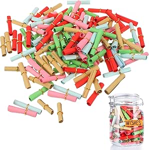 Oh wie süß! Diese 400 bunten Nachrichten-Kapseln mit Herz-Muster sind perfekt für romantische Botschaften und Grüße. Jede Kapsel ist 21x7 mm groß und enthält buntes Papier mit Herz-Druck - ideal für Liebesbriefe, Wünsche oder kleine Geheimnisse. Mit den 4 beiliegenden Holzstäbchen rollst du die Zettelchen easy ein und steckst sie in die Kapseln. Super für DIY-Projekte, ob als Geschenk im Glas, für die Hochzeitstischdeko oder einfach als Überraschung für den Partner. Die Kapseln sind aus buntem Papier gefertigt, sicher und ungiftig. Perfekt für Valentinstag, Hochzeiten, Weihnachten oder Geburtstage. Stell dir vor: Du füllst ein ganzes Glas mit lieben Botschaften - was für ein persönliches Geschenk! Die Metallringe halten sicher verschlossen. Einfach öffnen, beschriften, verschließen und verschenken! So machst du garantiert jedem eine Freude. Kreativität pur!