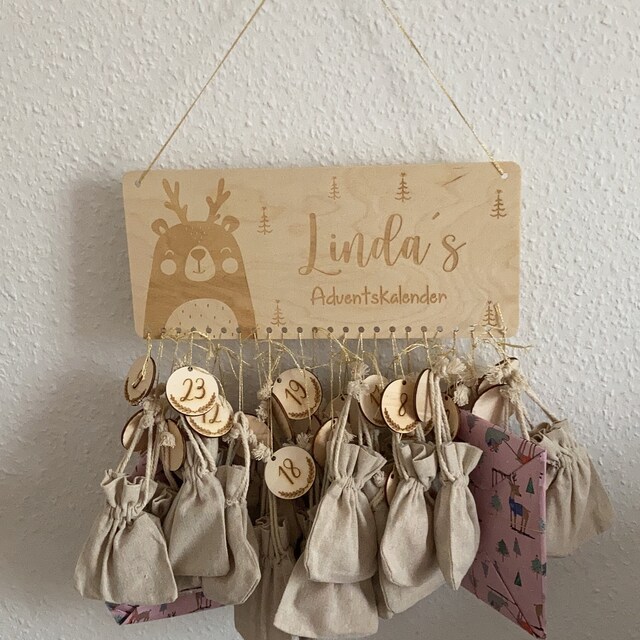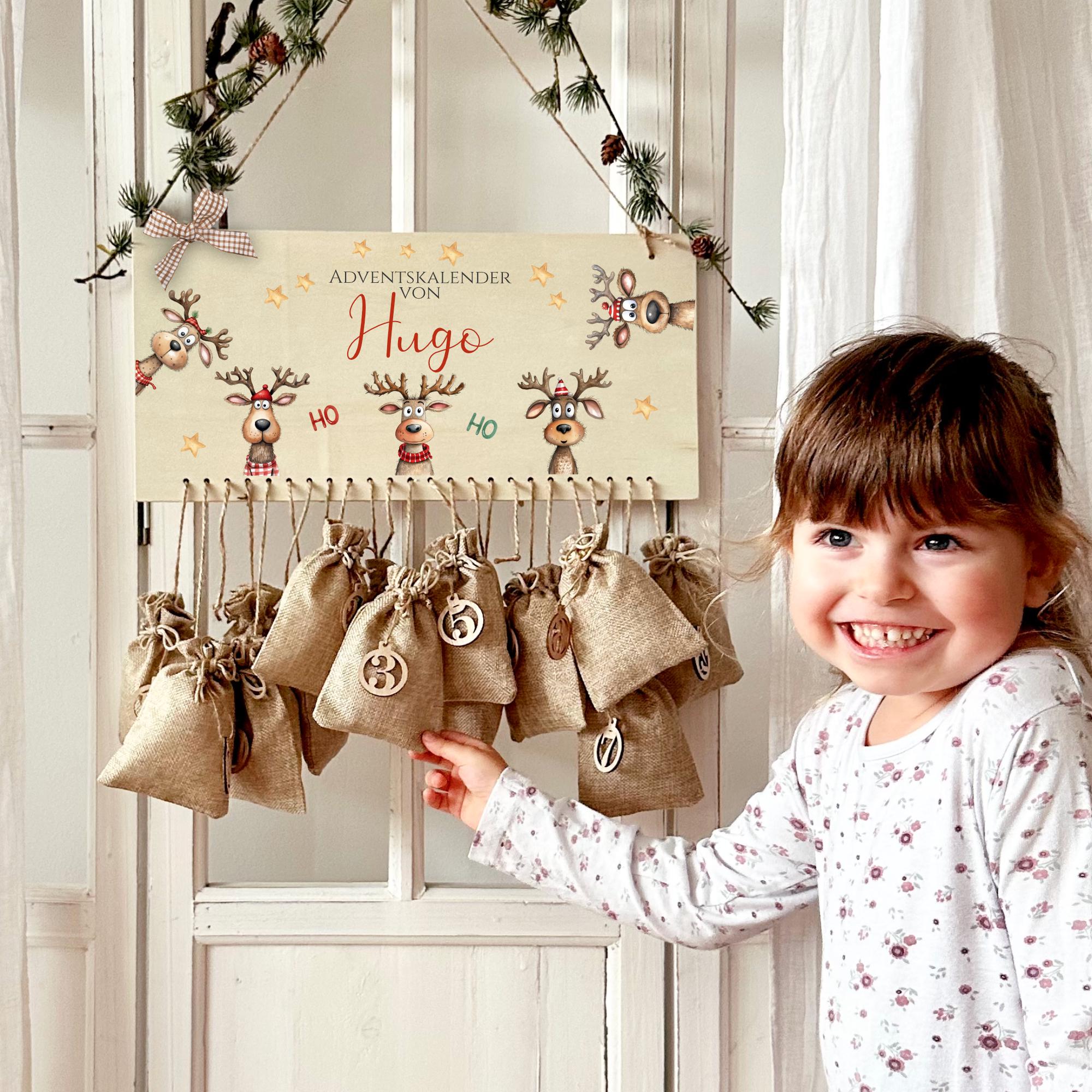 Weihnachtszeit ist die schönste Zeit - besonders mit diesem personalisierten Adventskalender! Das Holzschild (42x20 cm) wird mit dem Namen deines Kindes bedruckt, dazu kannst du aus 12 niedlichen Motiven wählen - ob Elch, Weihnachtsmann oder Schneemann. Es gibt drei Varianten: Nur das Holzschild, mit nummerierten Holzanhängern oder als Komplettset mit 24 Jutesäckchen (14x10 cm). Alles aus natürlichen Materialien, waschbar und wiederverwendbar - also super nachhaltig! Einfach die Säckchen mit Süßigkeiten, kleinen Spielzeugen oder Überraschungen füllen und mit dem Juteband befestigen. Made in Germany mit Liebe hergestellt - ein Begleiter für viele Weihnachtszeiten! Mach die Vorweihnachtszeit für deine Kleinen unvergesslich!