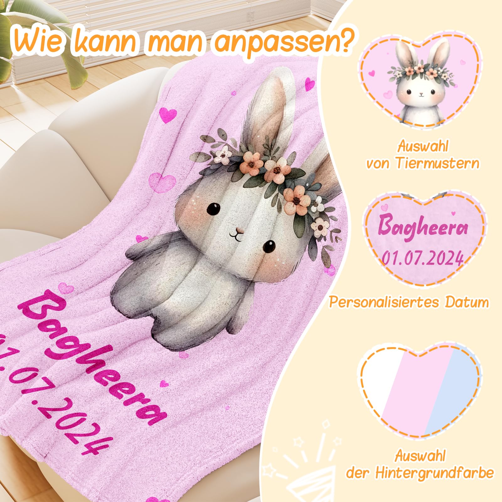 Stell dir vor: Eine superweiche Flanelldecke, die all die wichtigen Erinnerungen an die Geburt festhält. Du kannst zwischen verschiedenen Tierdesigns wählen - Koala, Bär, Elefant und viele mehr - und die Farben Weiß, Rosa oder Blau aussuchen.