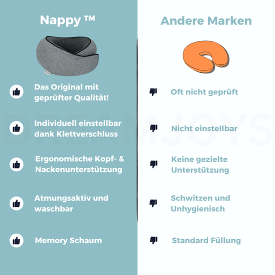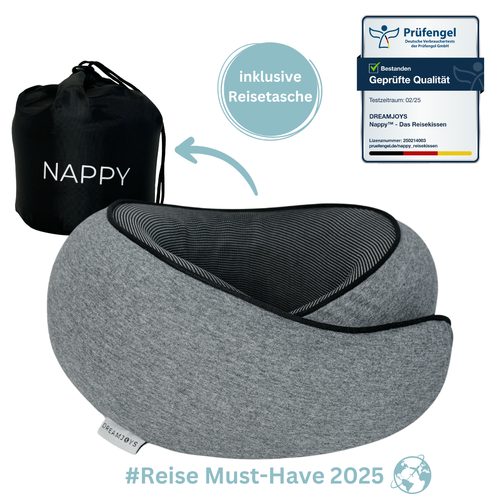 Endlich mal richtig erholsam schlafen unterwegs! Das Dreamjoys Nappy™ ist kein gewöhnliches Reisekissen – es wurde mit Hilfe von Ärzten entwickelt, um deinen Kopf in der perfekten Position zu halten. Ob im Flieger, Auto oder Zug: Der Memory Foam-Kern passt sich ideal an, lindert Nackenschmerzen und der Klettverschluss macht's individuell einstellbar. Und wenn du nicht schläfst? Klapp es einfach zusammen! In der praktischen Tragetasche wird es zur kompakten Rolle, die in jedes Handgepäck passt. Kein Rumgeknautsche mehr, kein steifer Nacken nach langen Fahrten. Einfach reinsinken, Augen zu und ab in den Wolken-Schlaf. Perfekt für Geschäftsreisende, Urlauber und alle, die unterwegs nicht auf Komfort verzichten wollen. Aus strapazierfähigem Material, leicht zu reinigen und in Sekunden aufgebaut. So macht Reisen wieder Spaß!