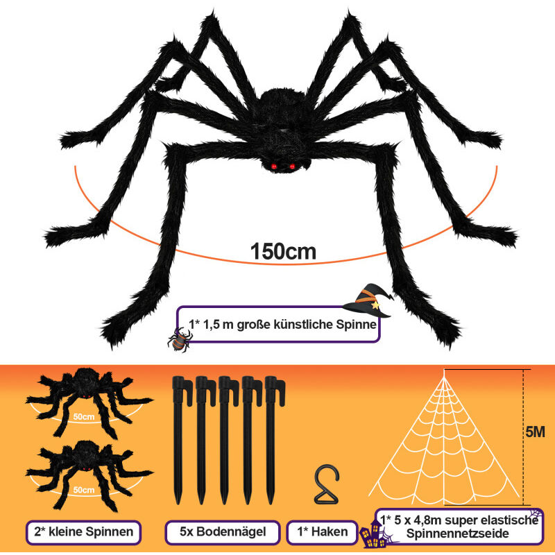 Boooo! Mach dein Haus zur Gruselburg mit diesem Mega-Spinnen-Set! Enthalten: 300g dehnbares Spinnennetz (deckt ca. 60m² ab), 50 schwarze Plastik-Spinnen, 20 gruselig-leuchtende Spinnen und eine RIESEN-Spinne von 150cm! Das Netz haftet überall ohne Kleber - einfach über Büsche, Zäune oder im Haus verteilen. Die Spinnen sehen super realistisch aus und die große Spinne an der Haustür jagt jedem einen Schrecken ein! Besonders cool: Die 20 leuchtenden Spinnen glimmen im Dunkeln - total gruselig! Alles ist wiederverwendbar und wetterfest. Nach Halloween einfach abnehmen und nächstes Jahr wieder verwenden. Perfekt für Halloween-Partys, Vorgarten-Deko oder um die Nachbarn zu erschrecken! Einfach aufhängen und fertig - mehr Grusel geht kaum!