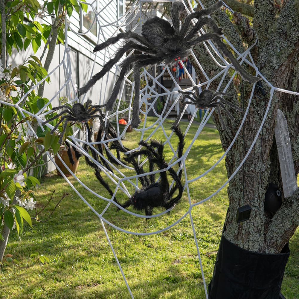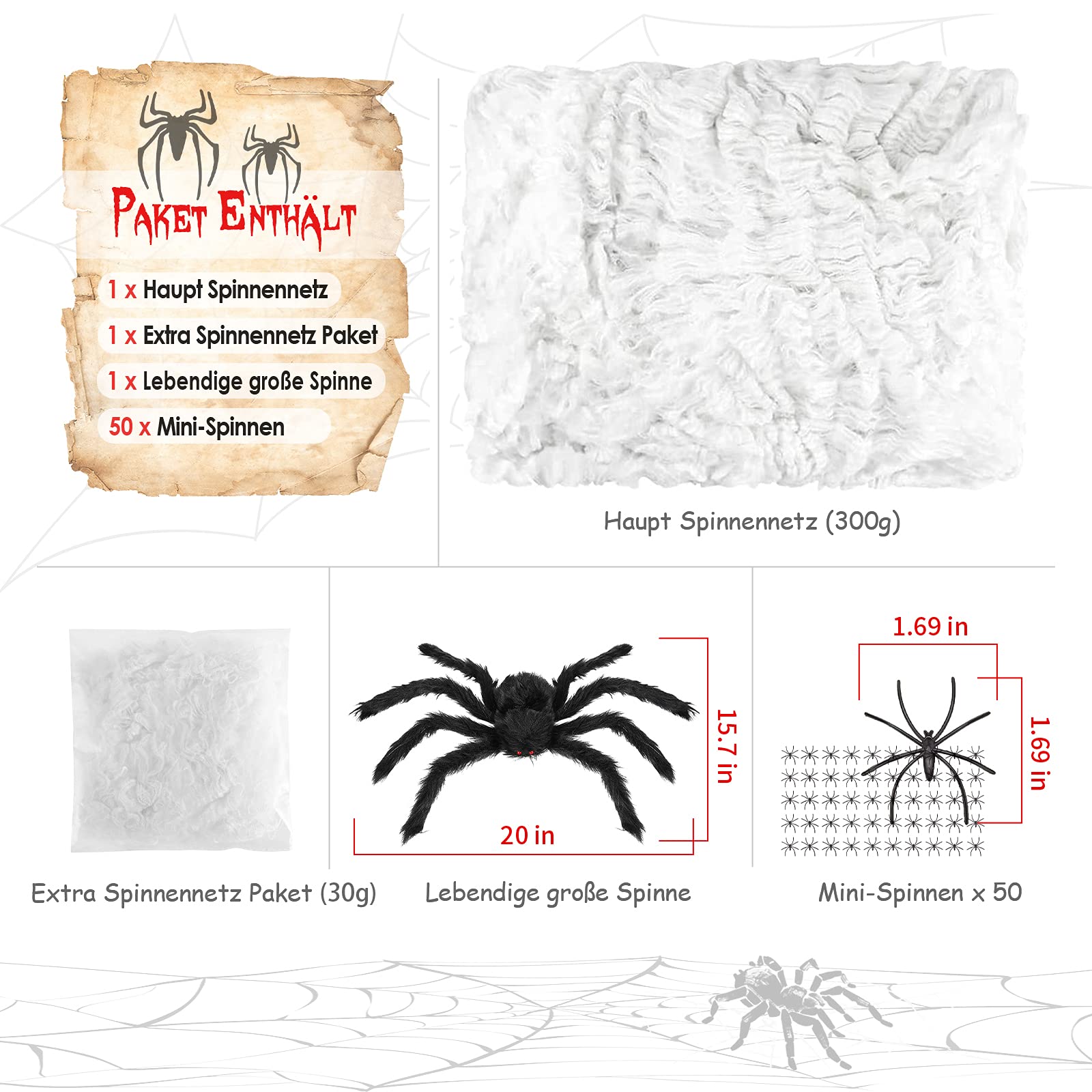 Halloween Spinnennetz Set - 300g Netz + 70 Spinnen + Riesen Spinne 150cm Gruseldekoration