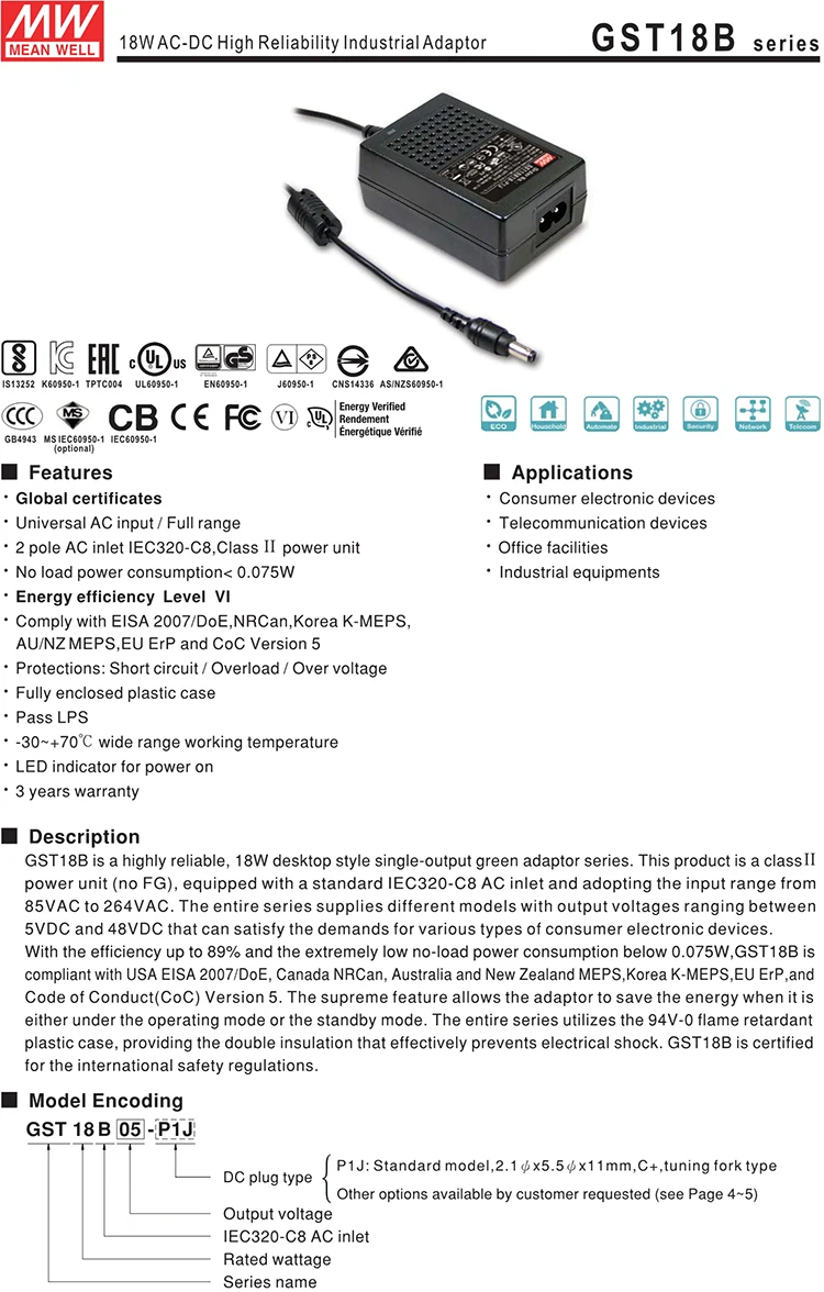Mean Well Netzteil 18W 1.73A - Energieeffizient Mit Mehrfachschutz Für Elektronik