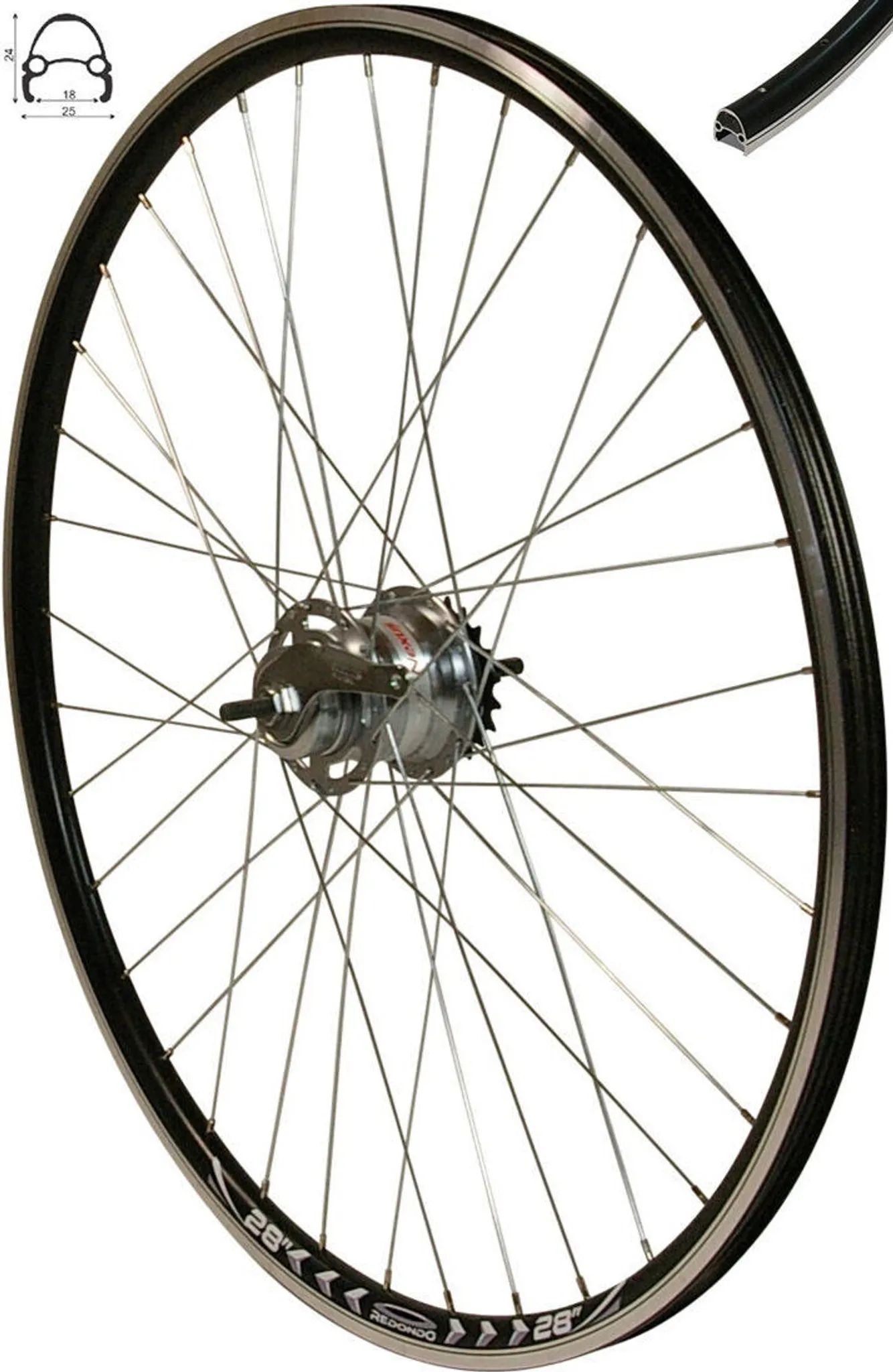 Perfekt für dein Fahrrad! Dieses hochwertige 28 Zoll Hinterrad von Redondo kommt komplett mit der zuverlässigen Shimano Nexus 3-Gang-Nabe inklusive Rücktrittbremse. Die stabile Hohlkammerfelge aus Aluminium 6061-T6 ist bereits fertig eingespeicht und zentriert - einfach einbauen und losfahren! Mit geschliffenen Bremsflanken für optimale Bremswirkung und 36 Speichen für maximale Stabilität. Im Lieferumfang sind sogar Schaltgriff, Bowdenzug und 19-Zahn-Ritzel dabei. Passt für Reifenbreiten von 35-62mm und hat eine Einbaubreite von 127,4mm. Ein echtes Komplettpaket für dein nächstes Fahrradprojekt!