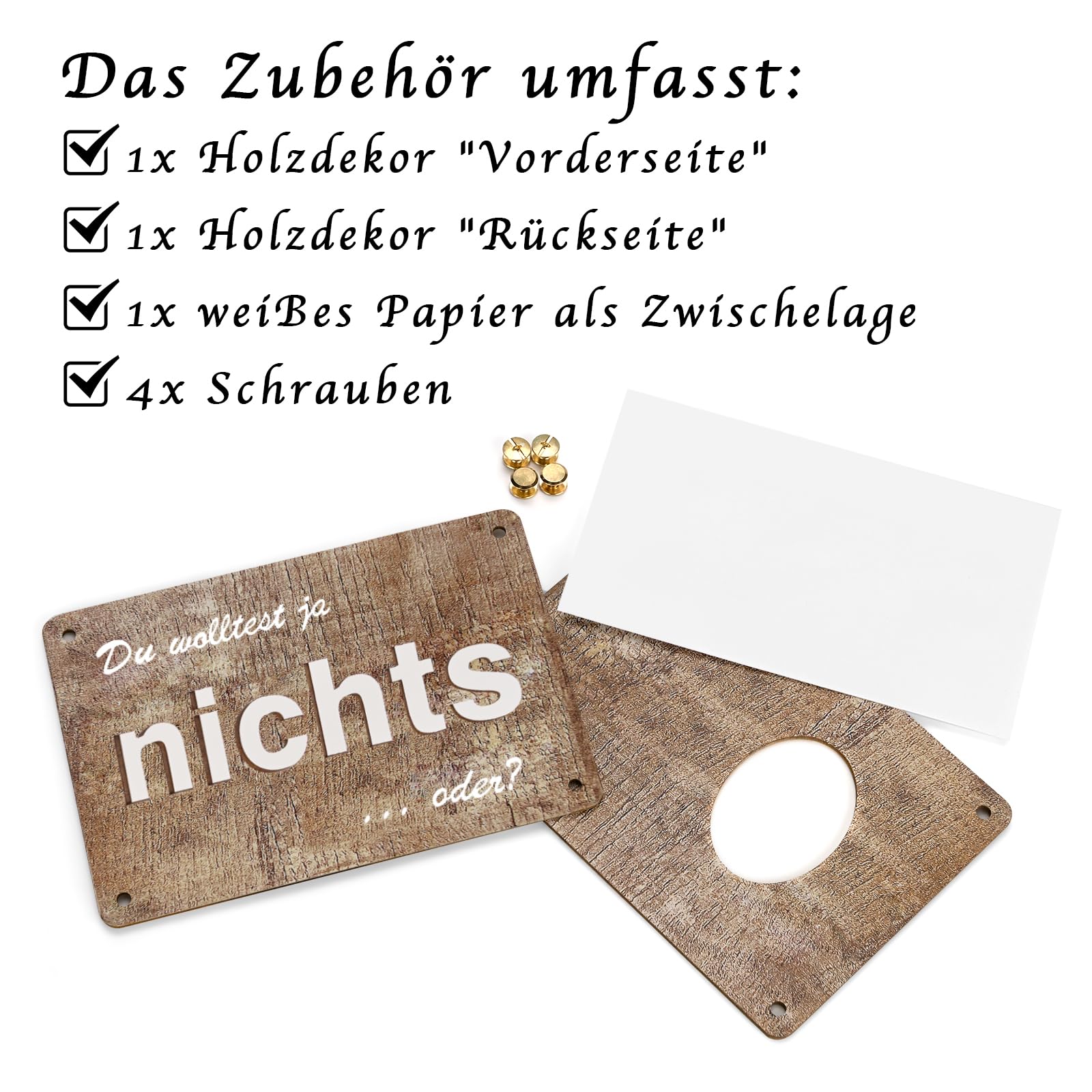 Du suchst ein Geschenk, das ankommt? Diese Holzkarte ist die Antwort! Einfach Münzen in die ausgehöhlten Flächen legen, sodass 'NICHTS' zu lesen ist – eine witzige und kreative Art, Geld zu verschenken. Auf der Rückseite kannst du persönliche Glückwünsche hinterlassen. Aus stabilem Holz, mit 4 Schrauben fixiert. Perfekt für Geburtstage, Hochzeiten, Taufen oder Reisen. Ein Geschenk, das garantiert für Lacher sorgt und lange in Erinnerung bleibt.
