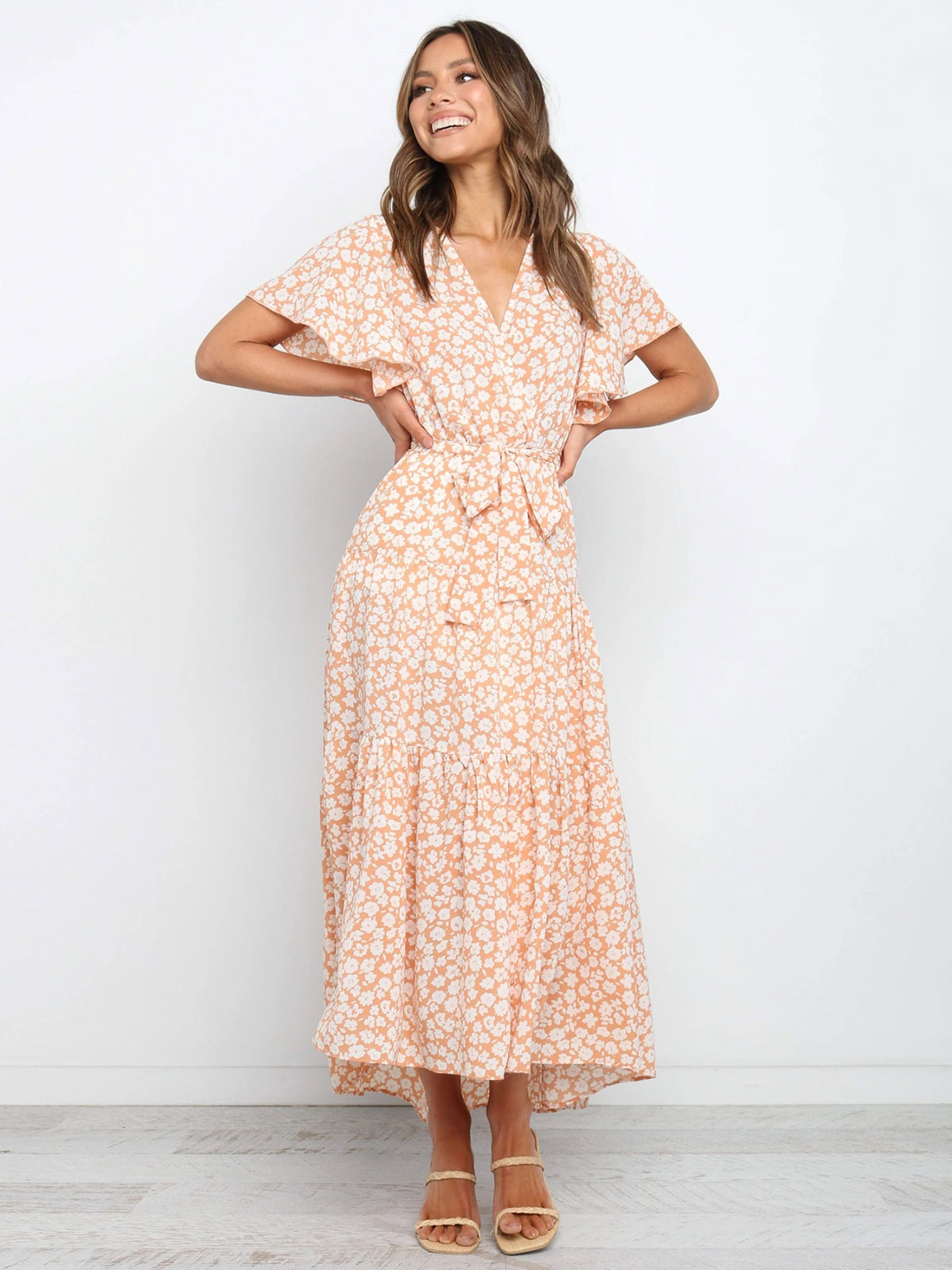 OLLWBYDM Damen Leopardenprint Maxikleid - V-Ausschnitt, Kurzärmlig, Sommerkleid Baumwollmix