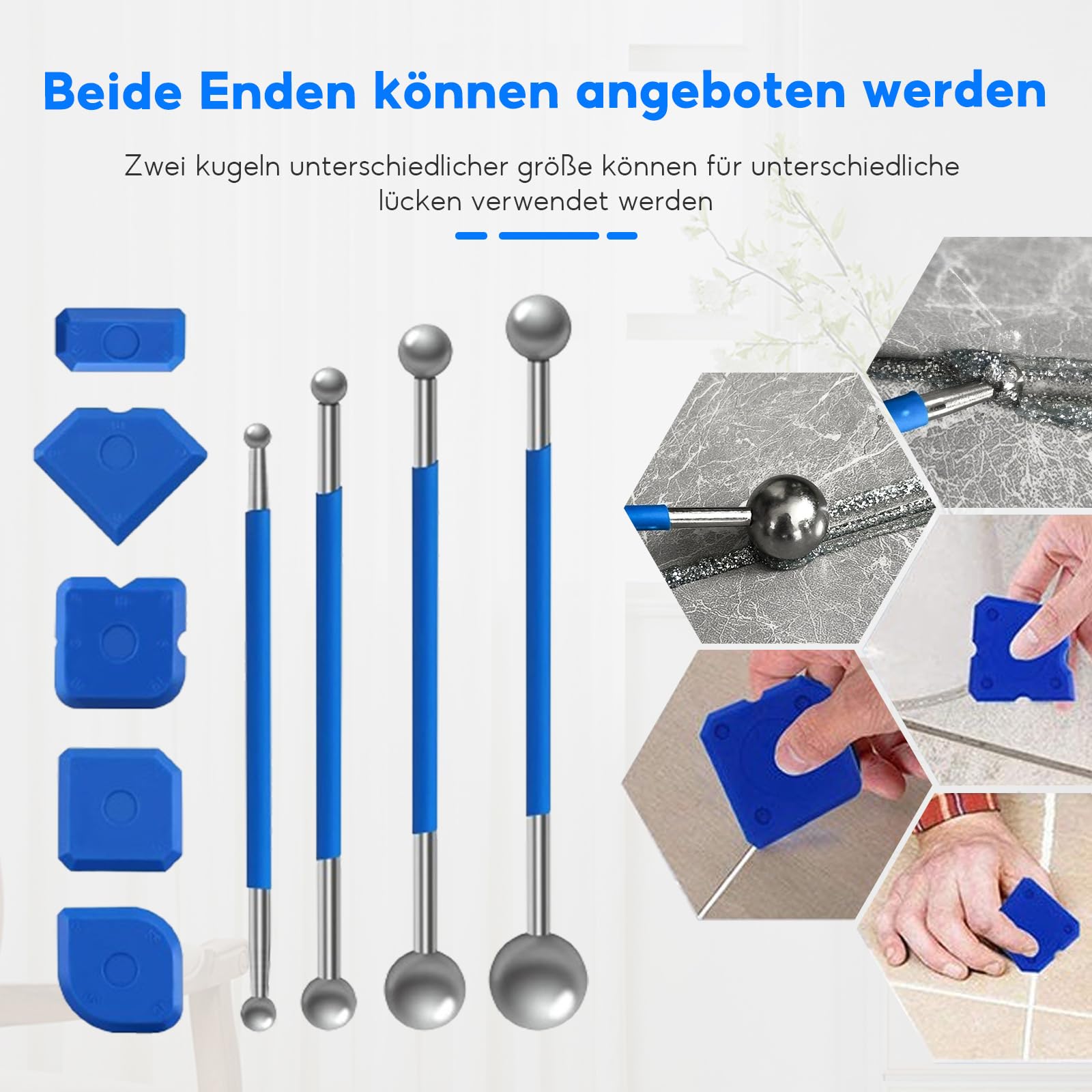 Perfekte Fugen ganz einfach! Dieses 9-teilige Fugenglätter Set macht dich zum Profi im Bad oder in der Küche. Enthält 4 Metallkugel-Werkzeuge (4-19 mm Durchmesser) und 5 Silikon-Fugenglätter in verschiedenen Formen. Aus robustem Stahl und langlebigem Kunststoff - leicht zu reinigen und wiederverwendbar. Perfekt für Fliesen, Glas, Kunststoff oder Metall. Die verschiedenen Größen passen für über 25 verschiedene Fugenbreiten. Ergonomisches Design liegt super in der Hand - keine Ermüdung auch bei längeren Arbeiten. Ob Heimwerker oder Profi - damit gelingen die Fugen garantiert gleichmäßig und sauber. Endlich keine unschönen Silikonränder mehr! Deine Fliesenarbeiten sehen danach aus wie vom Profi gemacht.