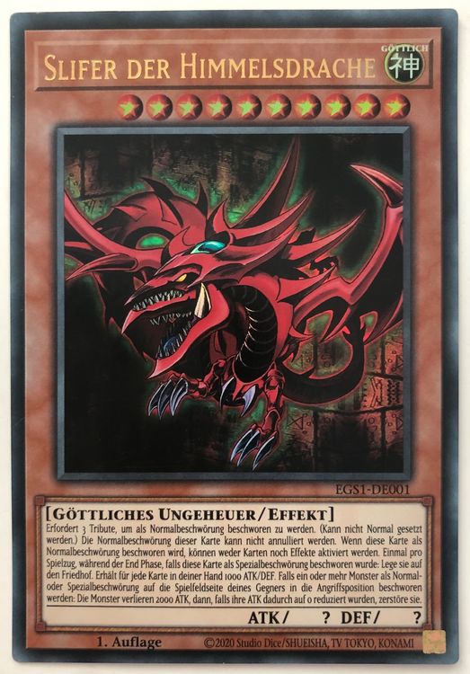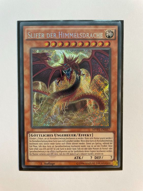Alter, was für eine Karte! Slifer der Himmelsdrache in SCR Seltenheit - ein absoluter Bringer im Yu-Gi-Oh Trading Card Game. Einer der drei ägyptischen Gottkarten, mega stark und begehrt. Perfekt für Turniere, Sammler oder um dein Deck aufzuwerten. Kommt in top Zustand, ideal für deine Sammlung oder zum Spielen. Jeder Yu-Gi-Oh Fan wird ausflippen bei diesem Fundstück! Ein echter Klassiker der die Herzen höher schlagen lässt.