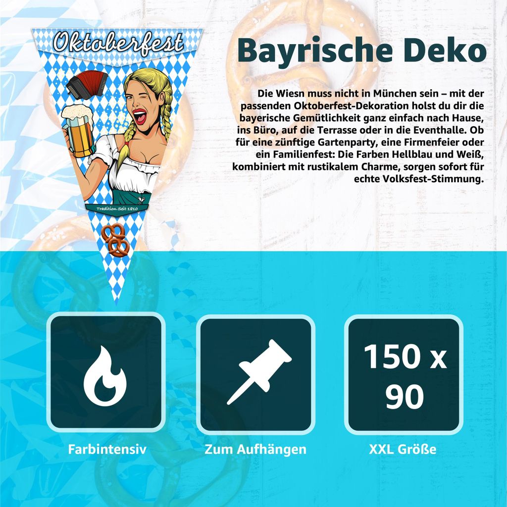 Hol dir echtes Oktoberfest-Feeling nach Hause! Mit dieser original bayrischen Wimpelkette in Blau-Weiß wird jede Party zum echten Bierfest. Das Set besteht aus 3 einzelnen Girlanden à 10m - insgesamt satte 30m Partystimmung! Jede einzelne Fahne misst 20x30cm und ist aus robustem PE-Kunststoff gefertigt. Das Beste: Die Wimpel sind wasserfest und verblassen nicht, egal ob du sie drinnen oder draußen aufhängst. Perfekt für Bierzelte, Gartenpartys, Bars oder einfach um dein Zuhause in eine bayrische Wohlfühl-Oase zu verwandeln. Die Girlanden sind schon fertig aufgenäht - einfach auspacken und aufhängen. Ob an der Decke, überm Zaun oder an der Terrasse - in Nullkommanichts hast du die perfekte Oktoberfest-Atmosphäre geschaffen. Mach dein nächstes Fest zu einem unvergesslichen Erlebnis mit dieser authentischen Bayern-Deko!