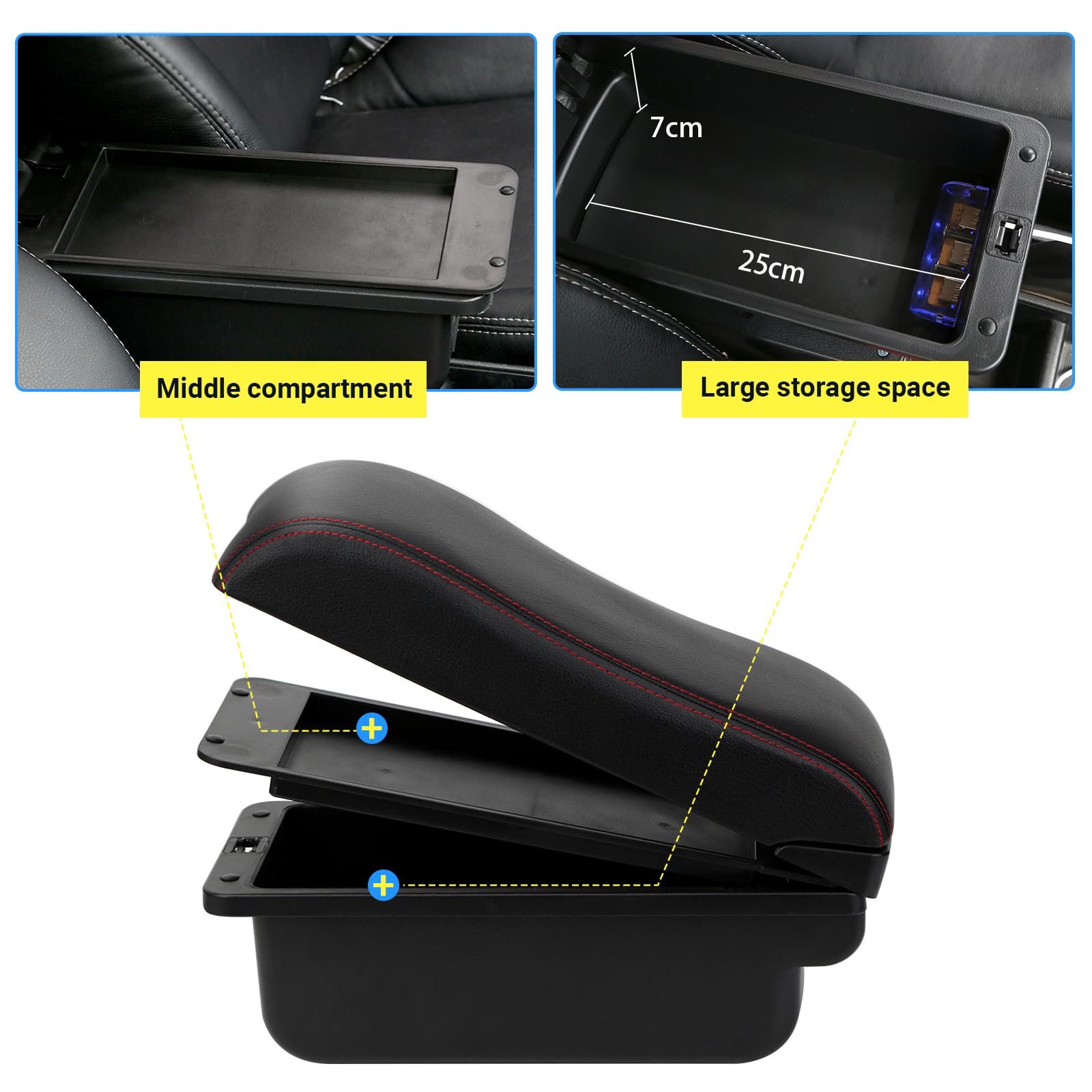 Aus hochwertigem PU-Leder - verschleißfest, staubdicht und wasserabweisend. Verdeckter Becherhalter und Aschenbecher hinten. Einfache Montage mit Schienensystem.
