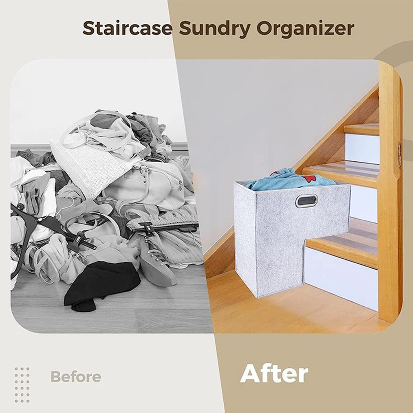 Kennst du das? Die Treppe wird immer zur Ablage für alles Mögliche? Dieser L-förmige Treppenkorb ist die geniale Lösung! Aus weichem Filz mit stylischen PU-Ledergriffen - sieht gut aus und ist super praktisch. Maße: 25x42x42cm, passt perfekt zwischen Treppenstufen von 16-21cm. Einfach reinstellen und schon hast du Ordnung auf der Treppe! Für Schuhe, Spielzeug, Bücher, Zeitschriften - was auch immer rumliegt. Der Korb ist faltbar, wenn du ihn mal nicht brauchst. Die glatte Unterseite schützt deine Treppen vor Kratzern. Und die stabilen Griffe machen das Tragen echt easy. Endlich keine Stolperfallen mehr auf der Treppe! Macht das Treppenhaus sofort aufgeräumter und sicherer. Einfach reinlegen - fertig! Total simple Lösung für ein altes Problem. Sieht dazu noch richtig dekorativ aus!