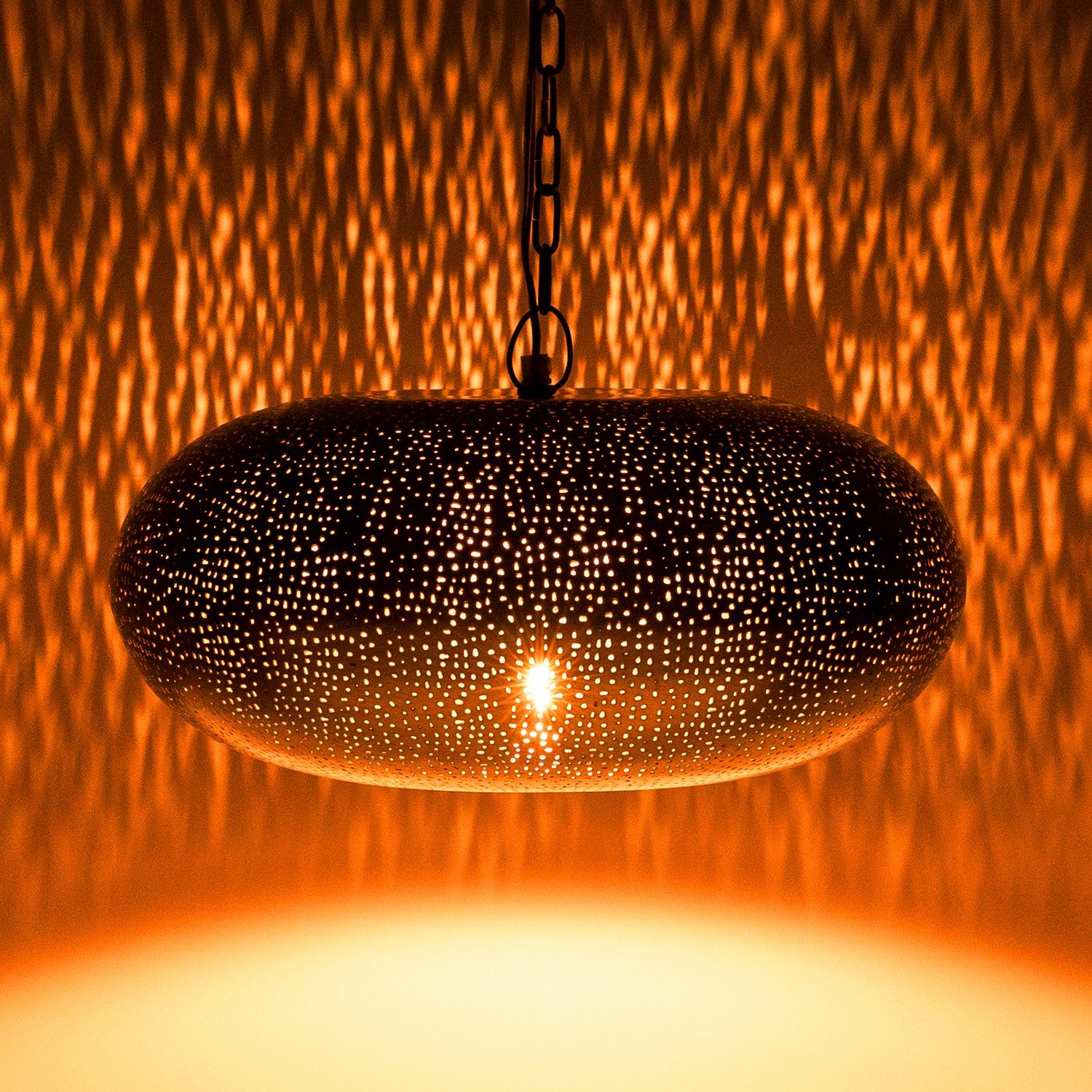 Tausendundeine Nacht für dein Zuhause! Diese wunderschöne Pendelleuchte im marokkanischen Stil verwandelt jeden Raum in eine orientalische Oase. Das goldfarbene Metall mit den feinen Perforationen wirft bezaubernde Lichtmuster an Wände und Decke. Handgefertigt in Indien - jedes Stück ein Unikat! Mit E14-Fassung für energiesparende LED-Leuchtmittel (bis 25W, nicht im Lieferumfang). Das 60cm lange Kabel und die verstellbare Aufhängung geben dir Flexibilität bei der Montage. Perfekt über dem Esstisch, in der Wohnung, Küche oder sogar im Flur. Schafft eine total gemütliche und romantische Atmosphäre. Ein echter Hingucker, der deine Einrichtung aufwertet!
